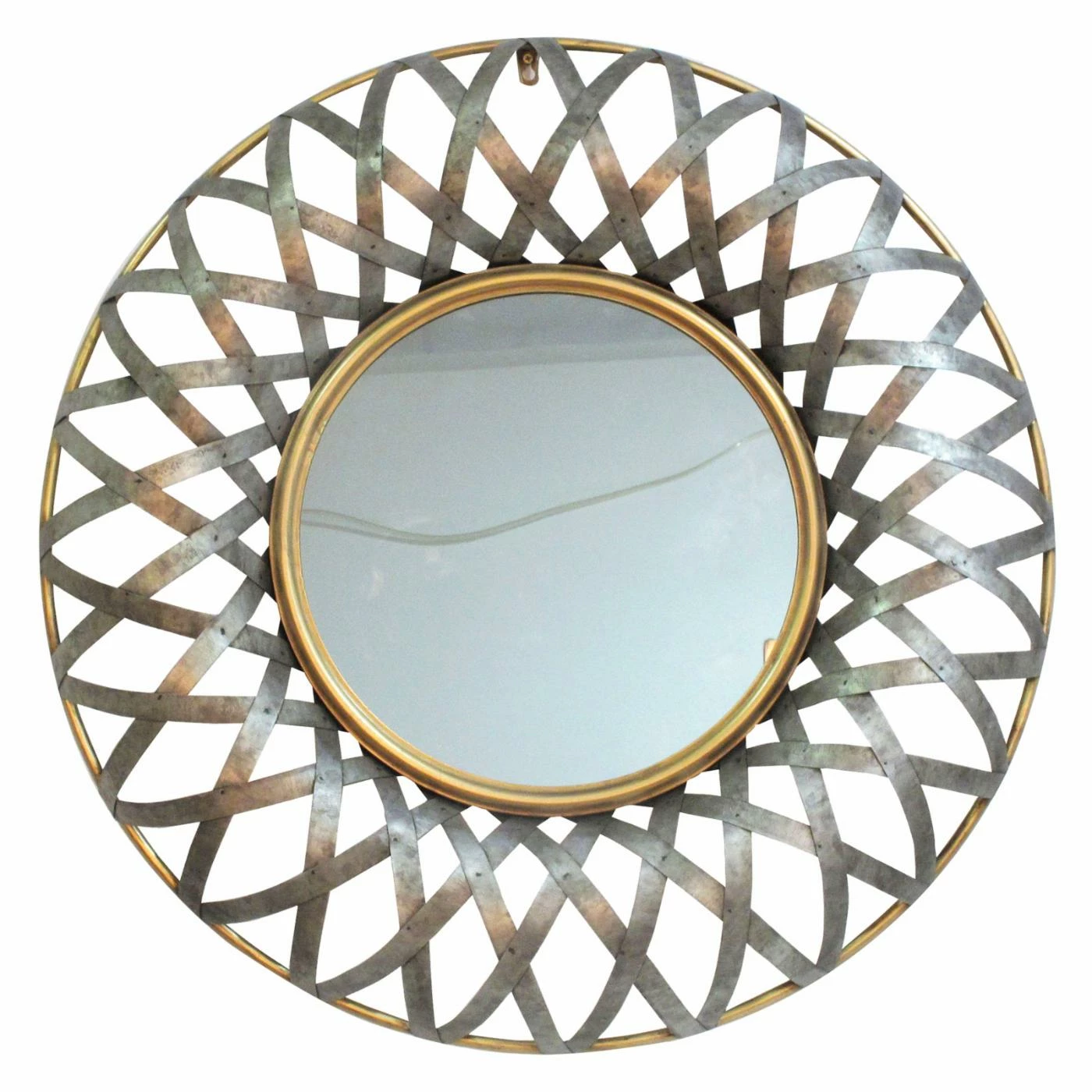 Crisscrossing strips of antique silver-finished metal create an open, domed frame around the A and B Home Metal Wall Mirror – 29.5 diam. in.. Inner and outer golden rings lend the perfect contrast to this round wall mirror that brings room-opening reflection to your living space.