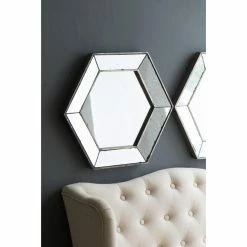 Add some sparkle to your home dΓ©cor with the A and B Home Herrick Hexagonal Mirror – 21 diam. in.. Featuring a hexagonal design with a wood frame, this mirror has a modern geometric shape that brings a simple yet elegant touch. A minimalistic design includes a black and white polka-dot design within the frame. A lustrous silver outline adds some extra shine.