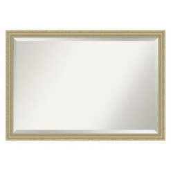 The Amanti Art Champagne Teardrop Wall Mirror – 39W x 27H in. delicately shimmers with a champagne-finished frame highlighted with decorative carvings crafted of wood. This glamorous wall mirror includes a beveled edge to accent contemporary homes as well as classic living rooms.