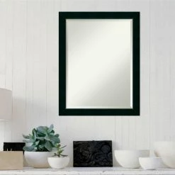 Achieve a look of modern elegance with the Amanti Art Corvino Narrow Black Wall Mirror – 21W x 27H in. This sleek mirror features a wide wood frame in a smooth, matte finish. Beveled edges add a graceful finishing touch.
