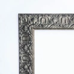 The texture-rich wood frame on this J and S Framing Luxor Wall Mirror is accentuated by a silver finish. The mirror within has a beveled edge that sparkles in the light. This mirror comes in size options and may be mounted horizontally or vertically.