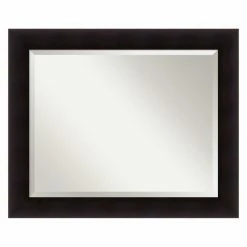 The rectangular J and S Framing Portico Wall Mirror – 33.63W x 27.63H in. may be hung horizontally or vertically. Its simple, wide wooden frame boasts a versatile espresso finish. The polished glass mirror within has a shimmering beveled edge.