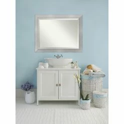The Amanti Art Romano Wall Mirror – 47W x 37H in. adds modern reflection to your bedroom or living space with its wide frame in a burnished silver finish. Hang this wall mirror in any space and enjoy the beveled edges that give it a refined look.