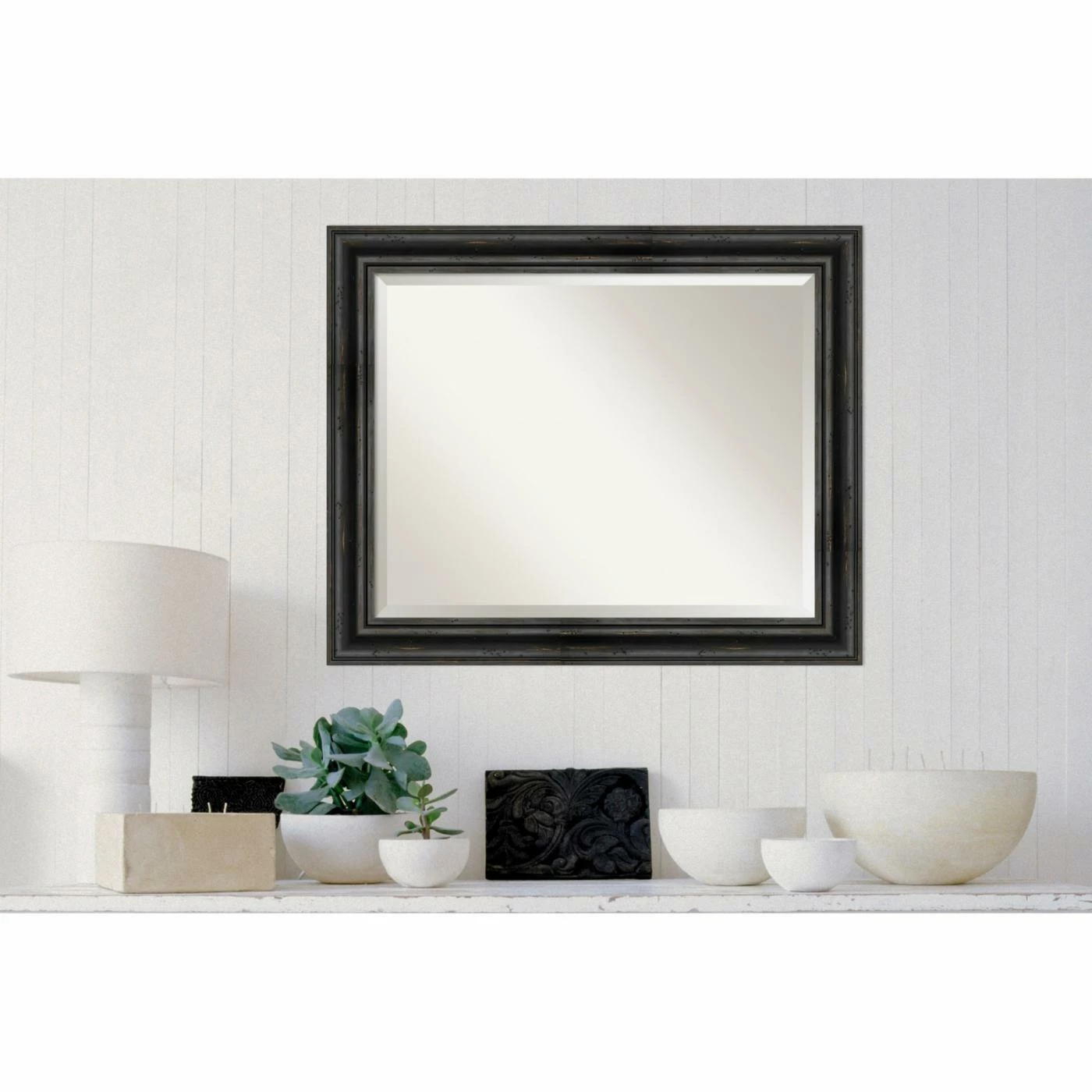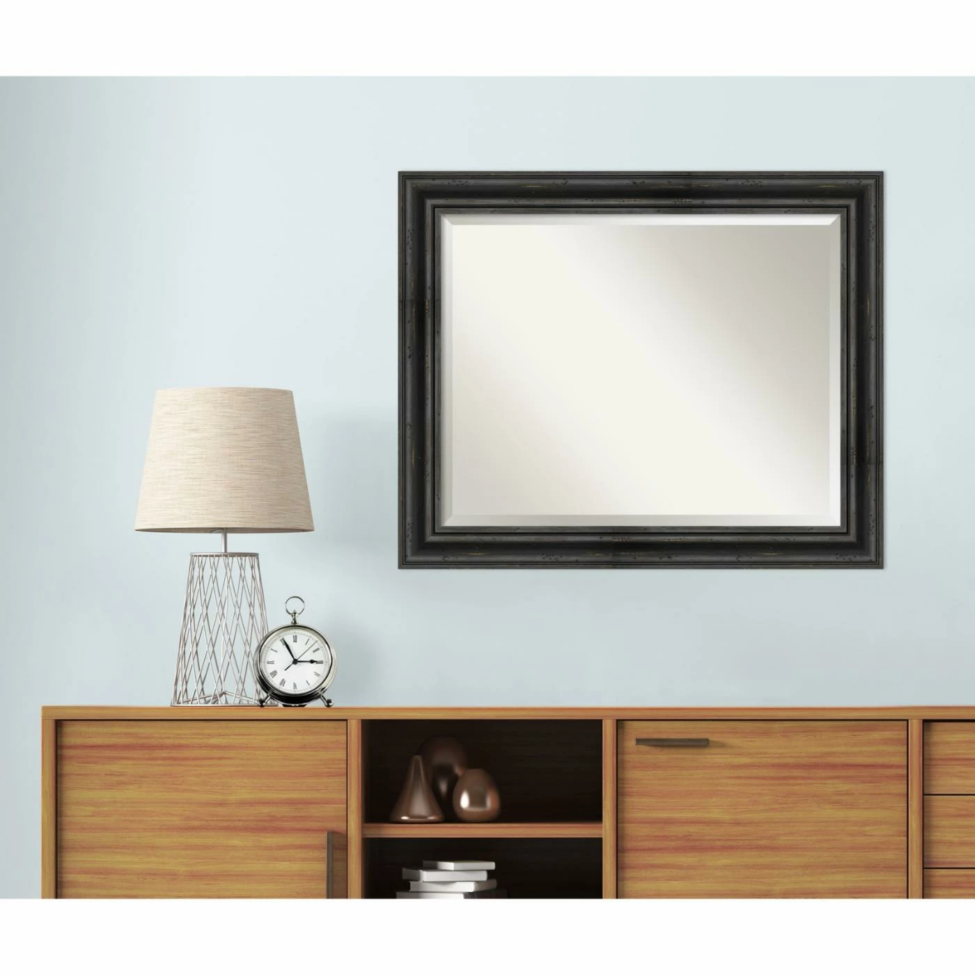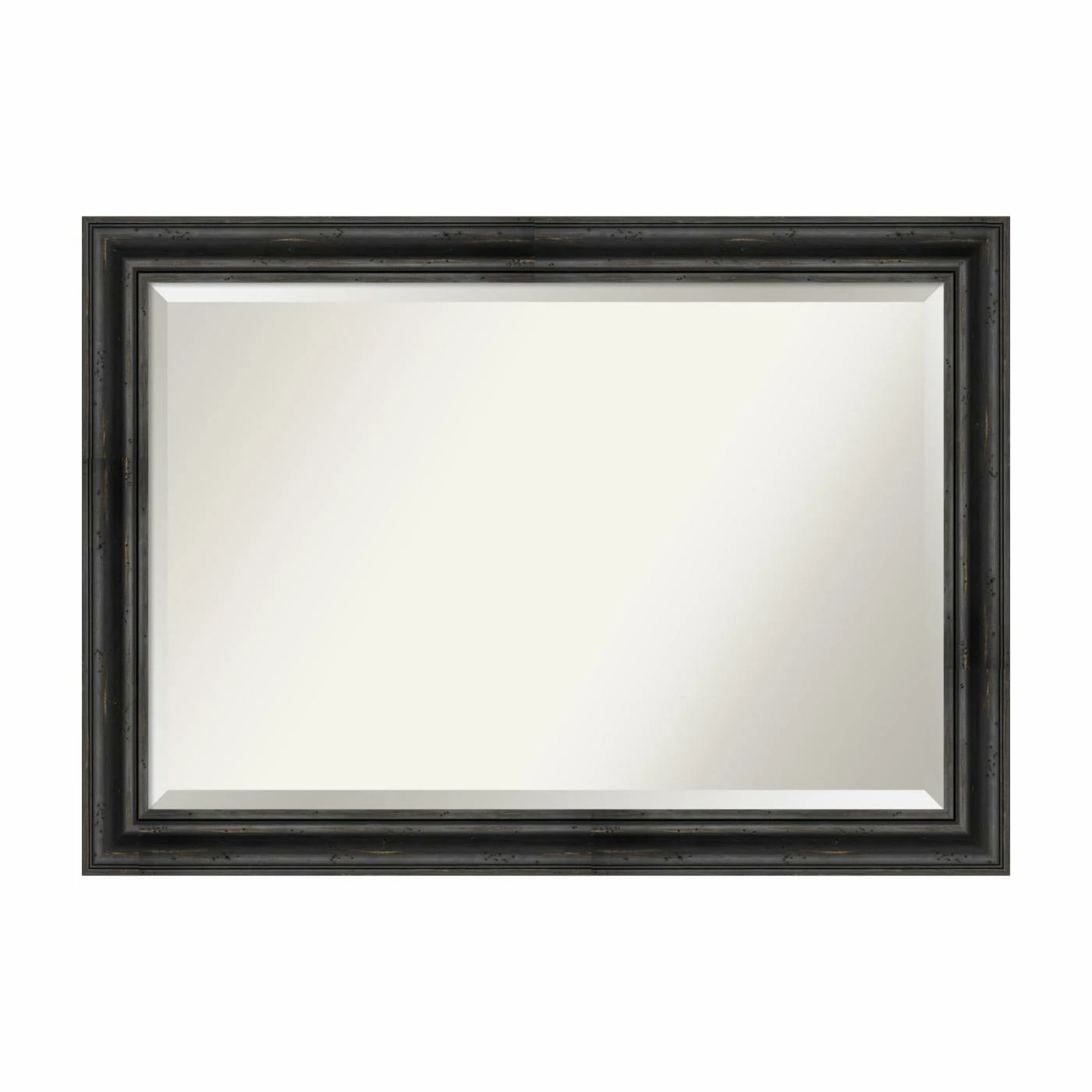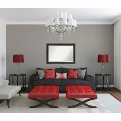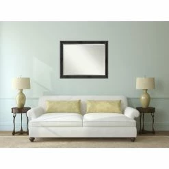 For a good match to industrial or farmhouse interiors, the Amanti Art Rustic Pine Decorative Wall Mirror features a stepped solid wood frame in a physically distressed aged black finish. For added shimmer and shine, the glass mirror within has a generous beveled edge. Install this mirror horizontally or vertically on any wall. It’s handcrafted in the USA and offered in a choice of available sizes.
