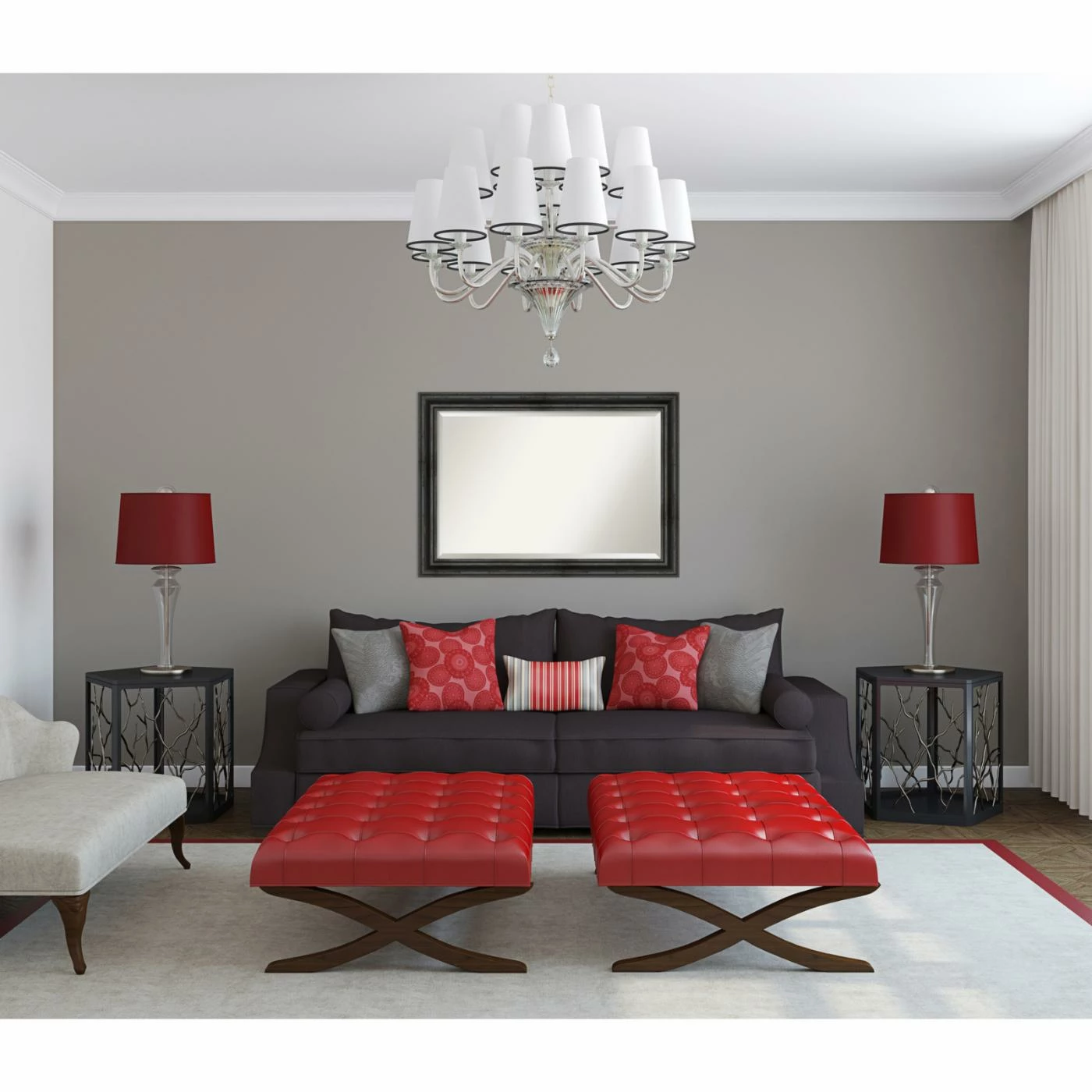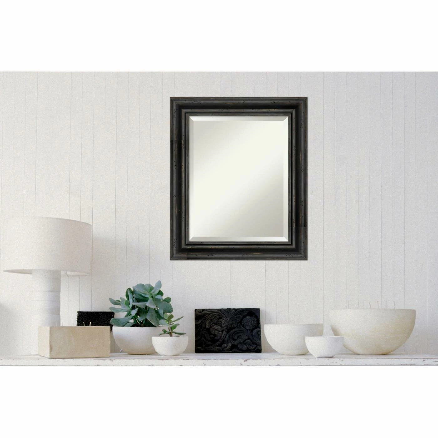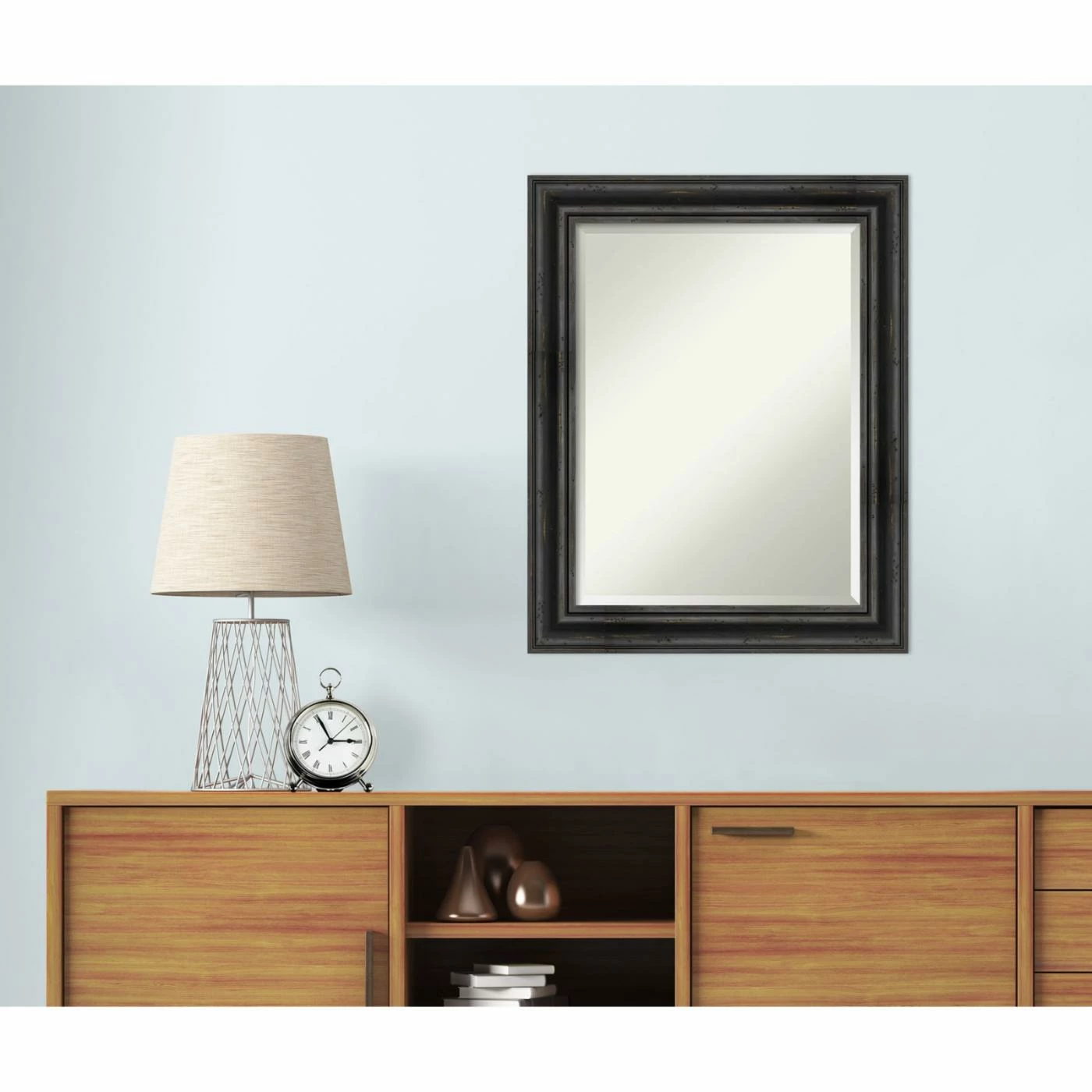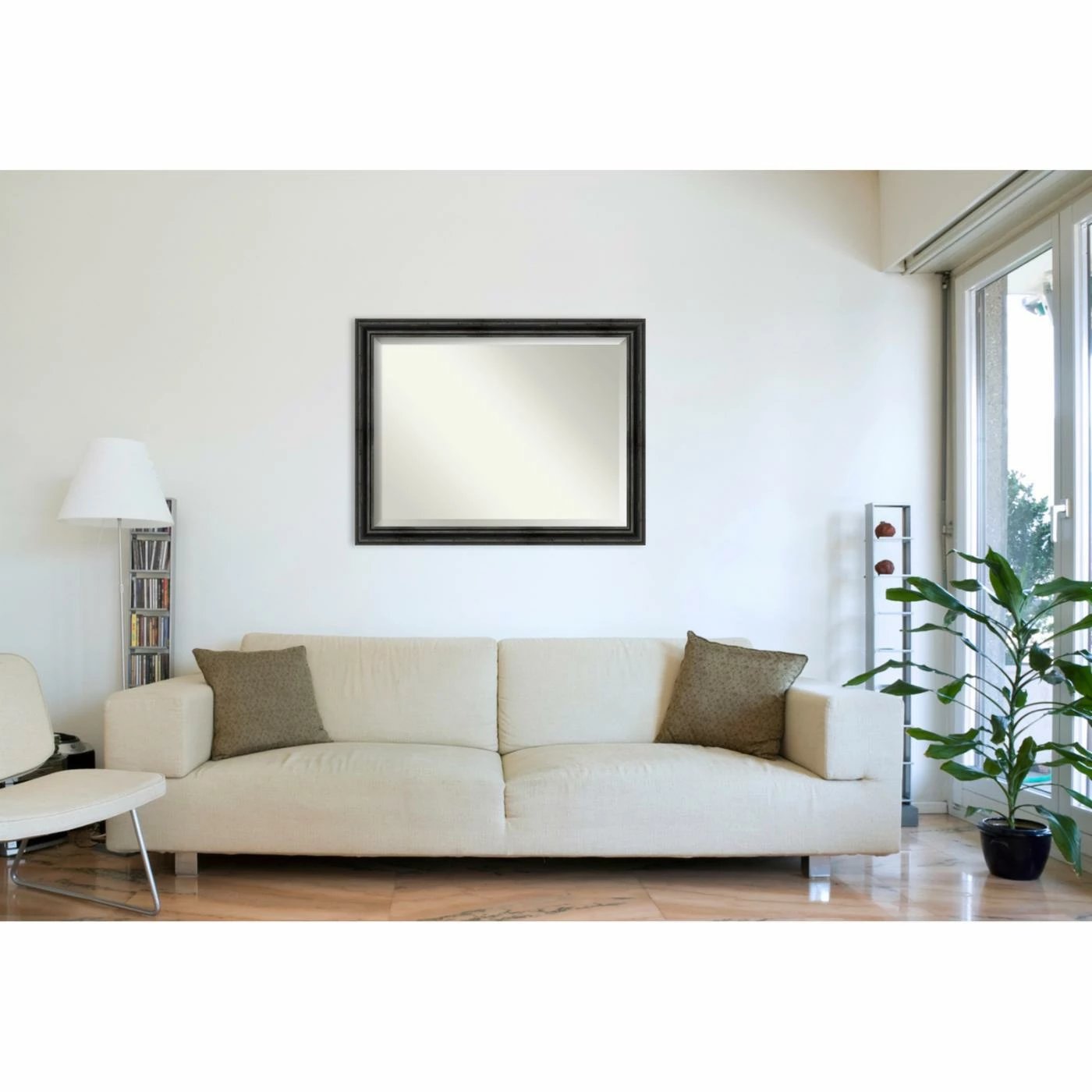 For a good match to industrial or farmhouse interiors, the Amanti Art Rustic Pine Decorative Wall Mirror features a stepped solid wood frame in a physically distressed aged black finish. For added shimmer and shine, the glass mirror within has a generous beveled edge. Install this mirror horizontally or vertically on any wall. It’s handcrafted in the USA and offered in a choice of available sizes.