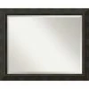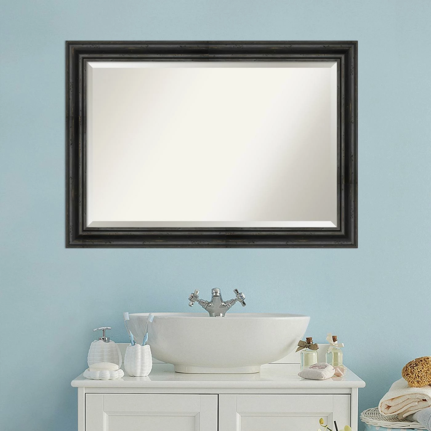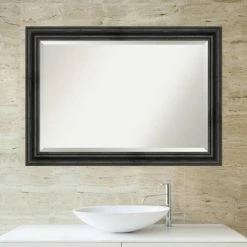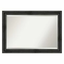 A gently distressed black finish and beveled edges are what make the Amanti Art Rustic Pine Rectangular Beveled Bathroom Vanity Mirror the ideal addition to your bathroom decor. The solid wood and hand craftsmanship provide a warmth and quality which enhances shabby and farmhouse-styled homes. Choose from the available size options to ensure a perfect fit, whether its displayed vertically or horizontally.