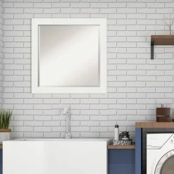 Display the Amanti Art Vanity White Narrow Framed Bathroom Vanity Mirror – 23W x 23H in. vertically or horizontally in your space. This mirror features a beveled edge, and it’s surrounded with a polystyrene frame. For easy installation, it’s equipped with hanging wires.
