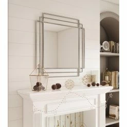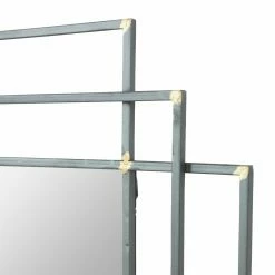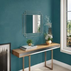 Criss-crossing rectangles come together for a sophisticated design in the Aspire Home Accents Dmitry Modern Wall Mirror – 32.5W x 32.5H in.. Great for modern styles, itβs useful on the wall or as a bathroom vanity mirror. Dark gray finish coupled with gold solder joints add character to the piece and let it pop on any wall. The overall appearance makes it also suitable for industrial or rustic decor.