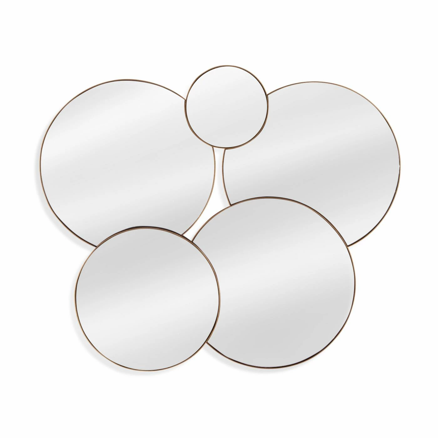 Round mirrors are gathered together in the Bassett Mirror Company Calista Wall Mirror‘s bubble-inspired design. This mirror is framed simply in durable metal with a luxurious gold and brass finish.