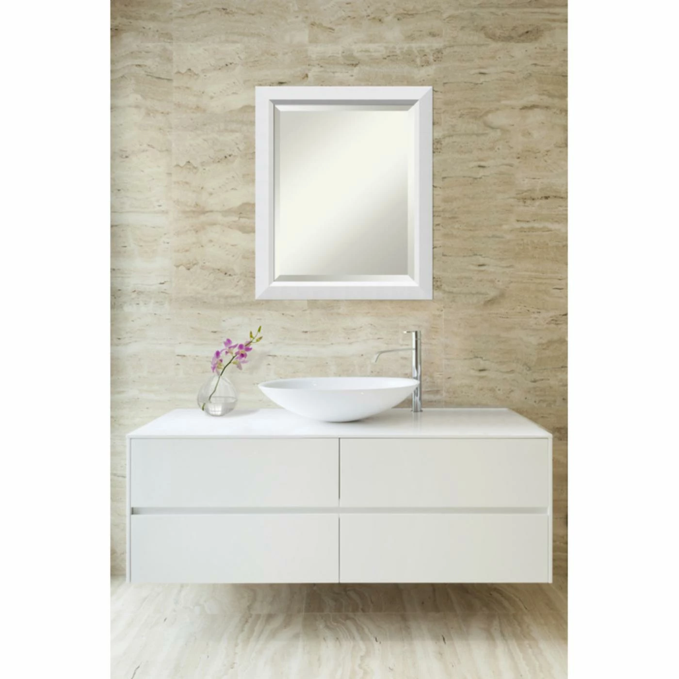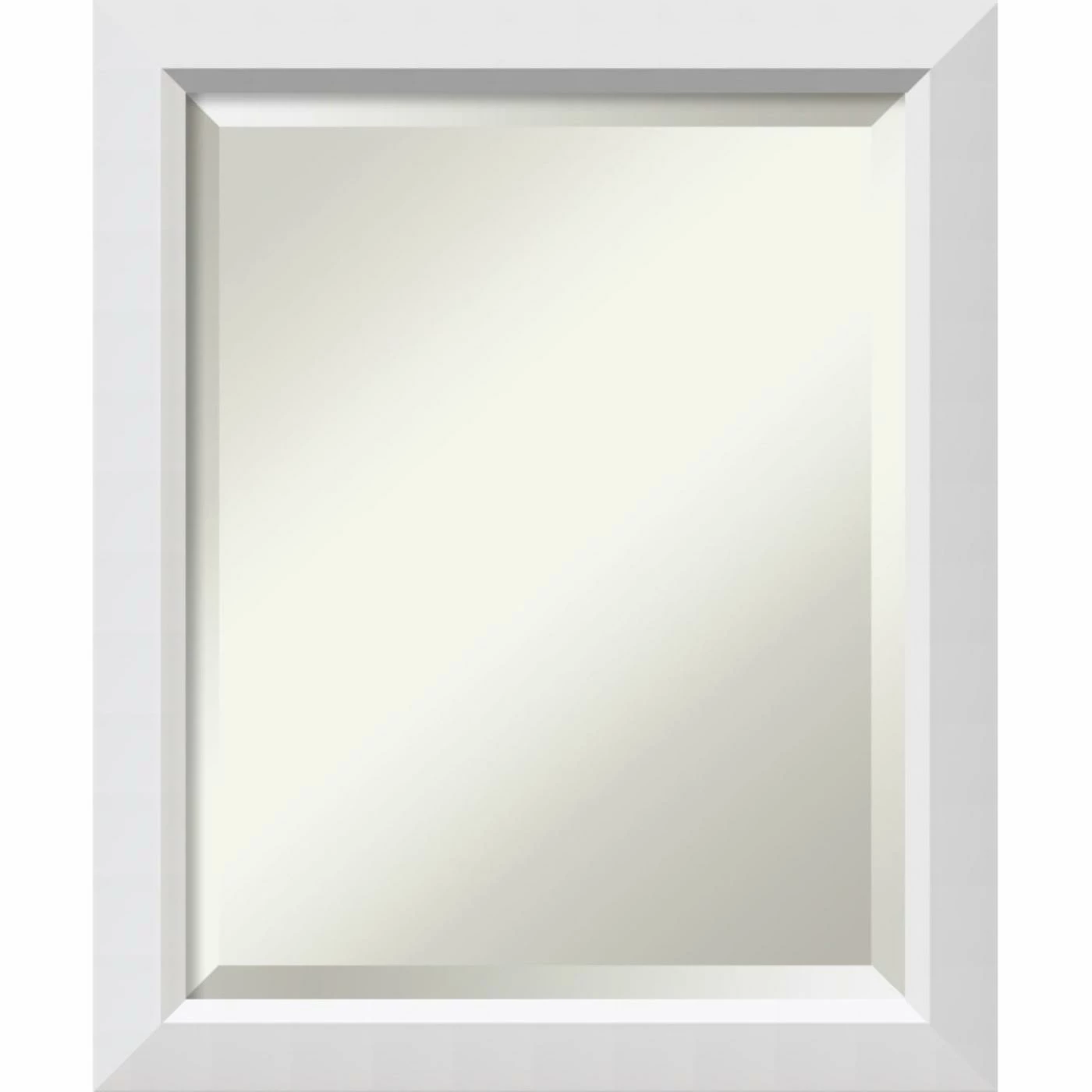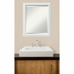 A simple white frame makes a delicate statement with the Amanti Art Bathroom Wall Mirror – Blanco White. Choose from available sizes to personalize this pure white beveled mirror to your home. Able to be hung vertically or horizontally, a solid wood frame creates a simplistic look that goes with other furniture or may stand alone.