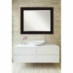 Include the Amanti Art Bathroom Wall Mirror – 33.63W x 27.63H in. in your motif for a touch of elegance to a needed space. Able to be hung vertically or horizontally, this wood-framed mirror is sturdy enough to last a lifetime. Finished in a deep portico espresso, this mirror brings light and dimension.