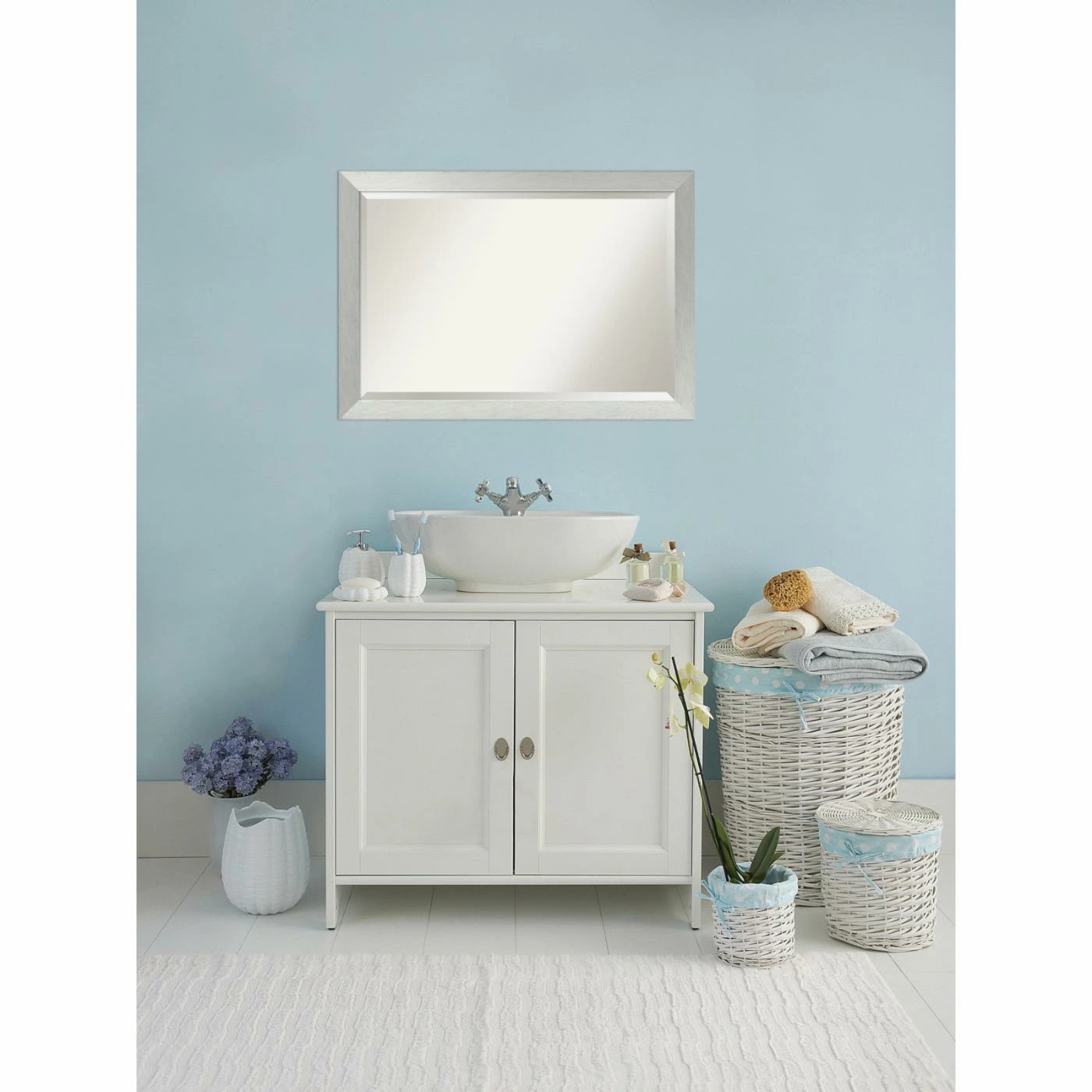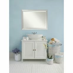 The Amanti Art Brushed Sterling Silver Bathroom Mirror has endless contemporary flair with its smooth carved wood frame in a sleek brushed silver finish. Install this stylish bathroom mirror over your vanity to prepare for the day in modern style.