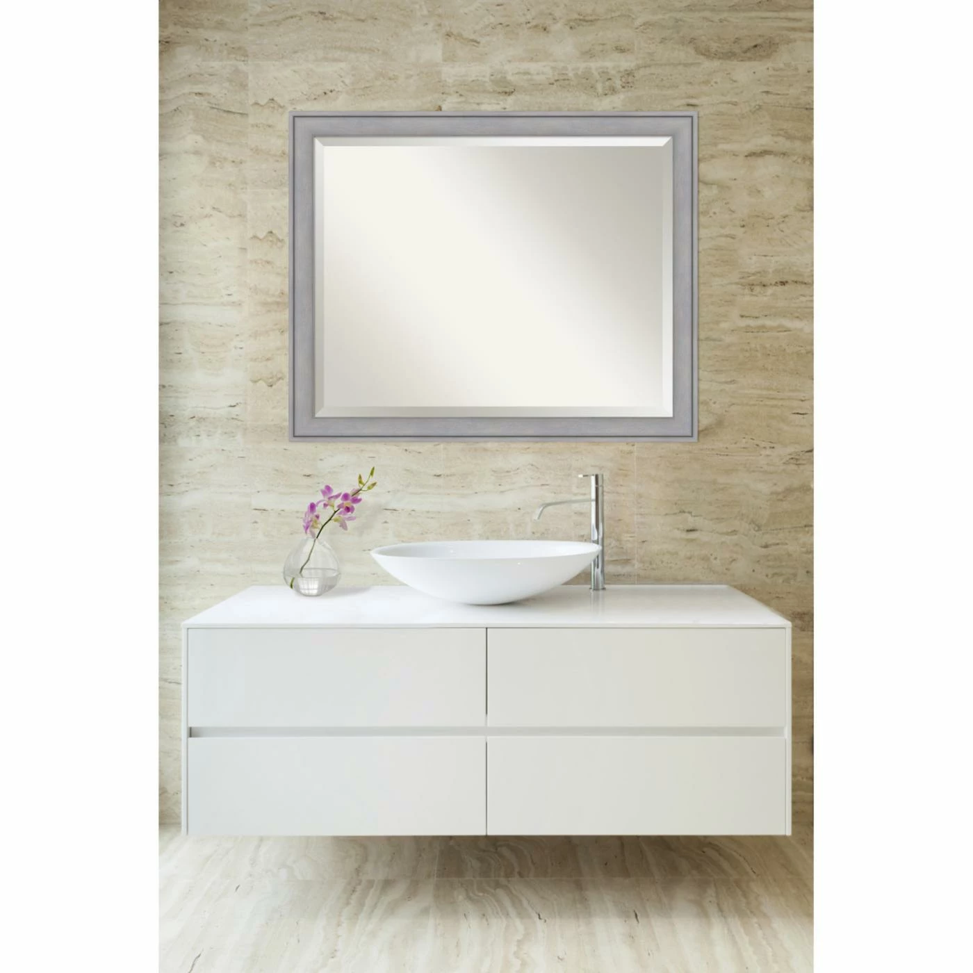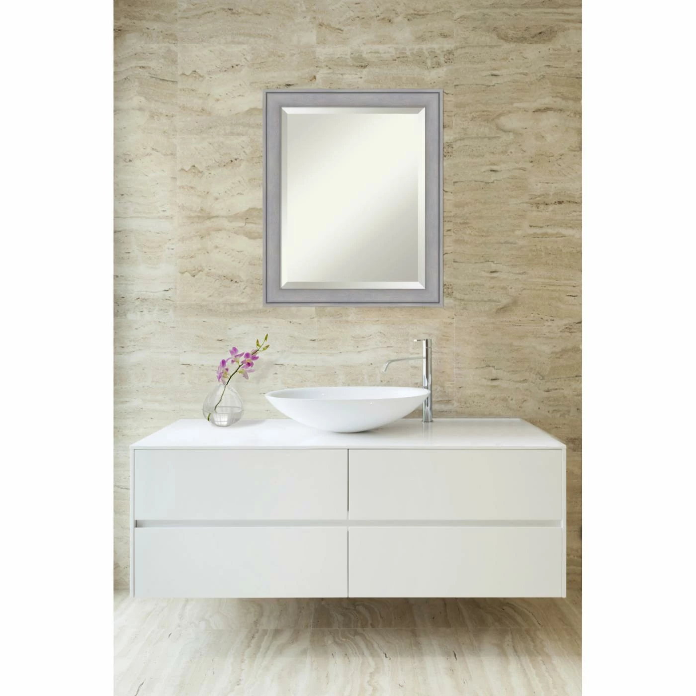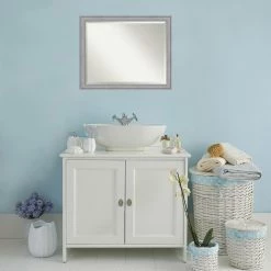 Bring your bathroom some on-trend versatility with the Amanti Art Graywash Bathroom Mirror, featuring a carved wood frame highlighted in a rustic gray wash finish. This handsome bathroom mirror is ideal for a guest bath, powder room, or master suite and includes a beveled edge for a refined touch.