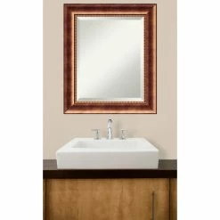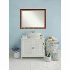 The Amanti Art Manhattan Bathroom Mirror will enrich your bathroom with its wide wood frame a bold burnished bronze finish. Perfect for master bath, this handsome bathroom mirror includes beveled edges and your choice of available size.