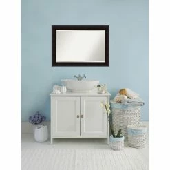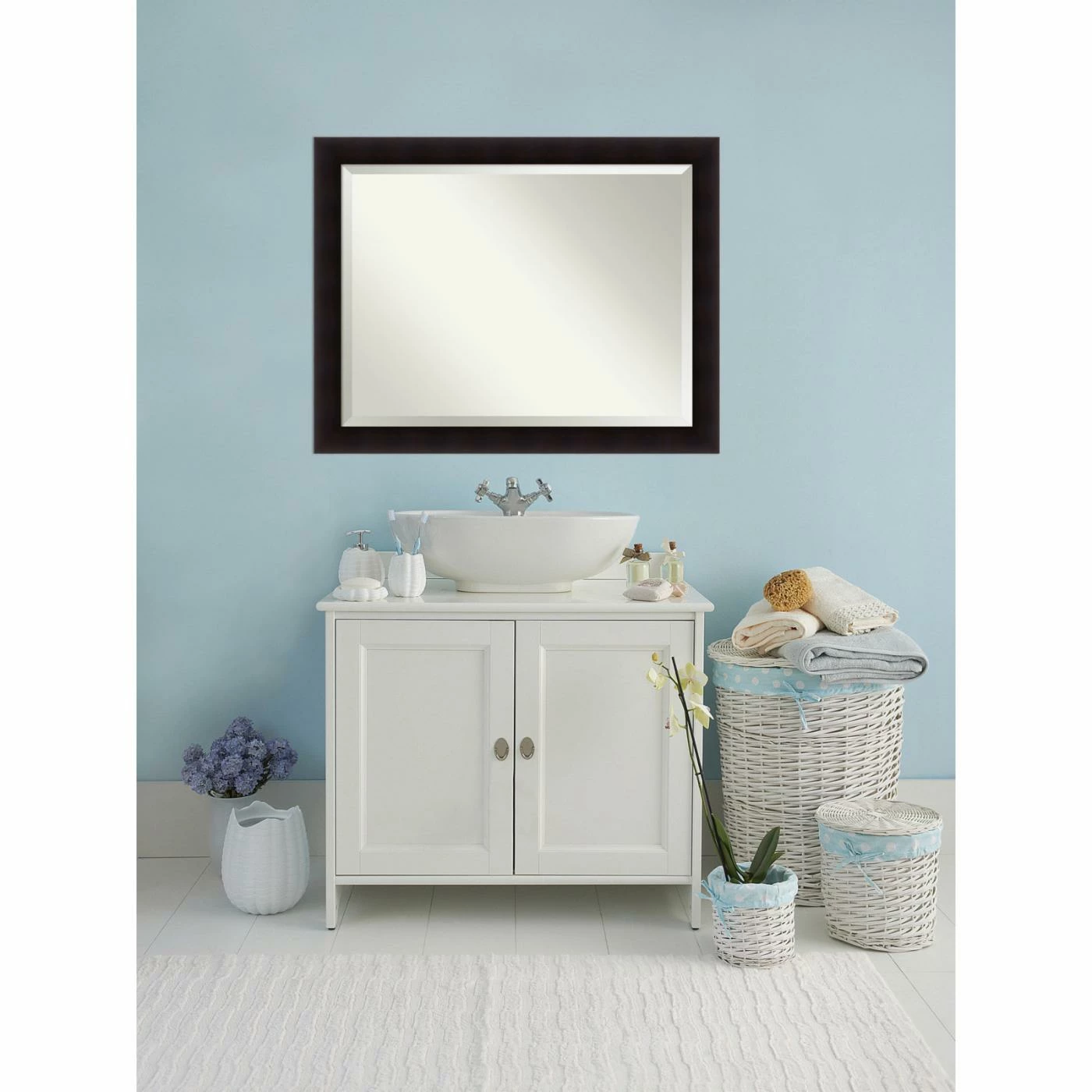 Invoking a warm look, the Amanti Art Portico Bathroom Mirror infuses a richness into your bathroom with its carved wood frame in an espresso color. Hang this sturdy bathroom mirror over your vanity and enjoy the beauty of its beveled edges.