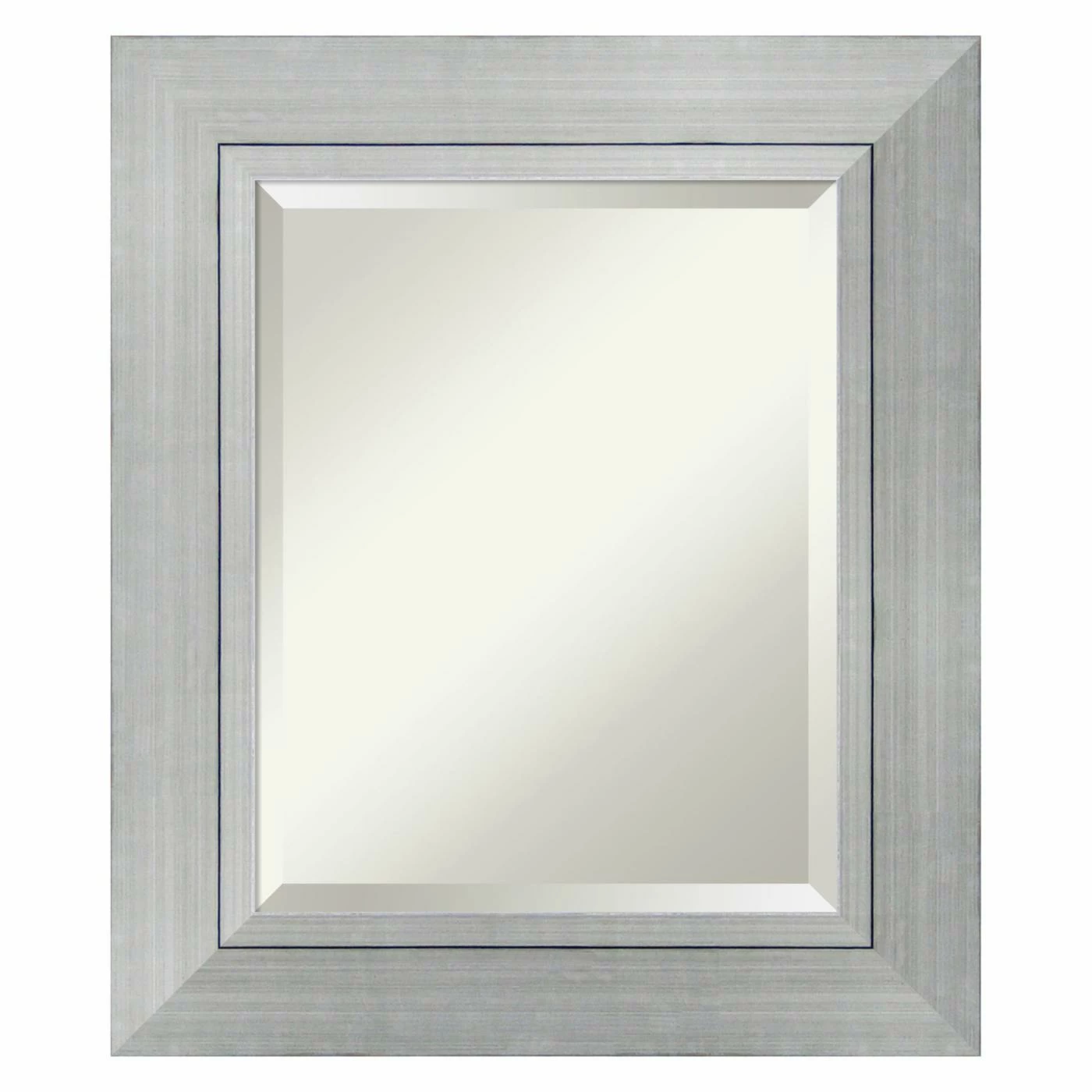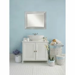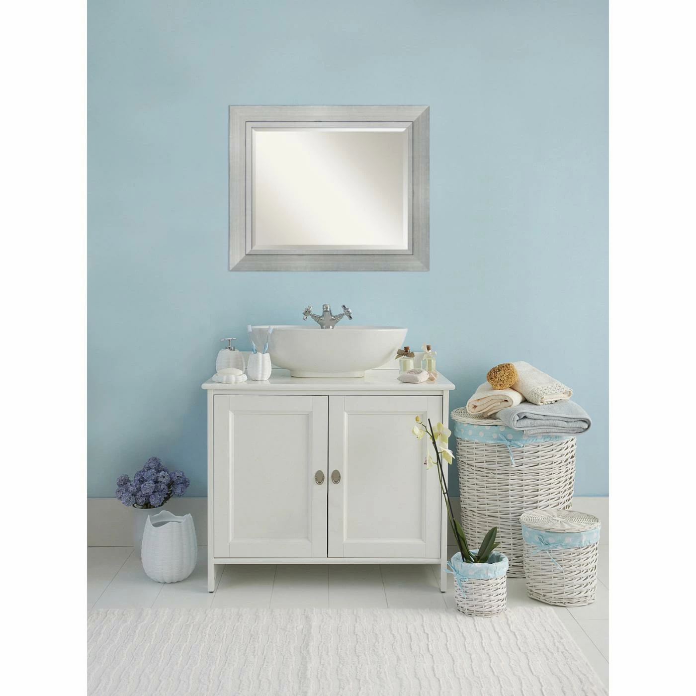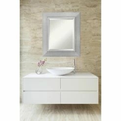 Bring contemporary design into your bathroom with the Amanti Art Romano Bathroom Mirror. This ultra-modern bathroom mirror features a wide, angular frame in a sleek burnished silver finish and beveled edges for a stylish finishing touch.