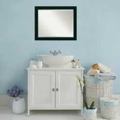 The Amanti Art Tribeca Bathroom Mirror is versatile yet bold thanks to the wide wood frame in a stylish matte black finish. Display this bathroom mirror over your vanity, and a beveled edge gives it a splash of sophisticated flair.