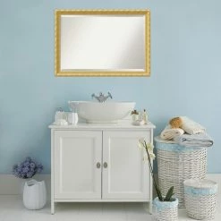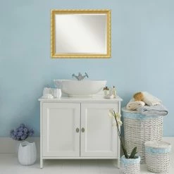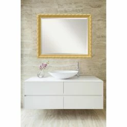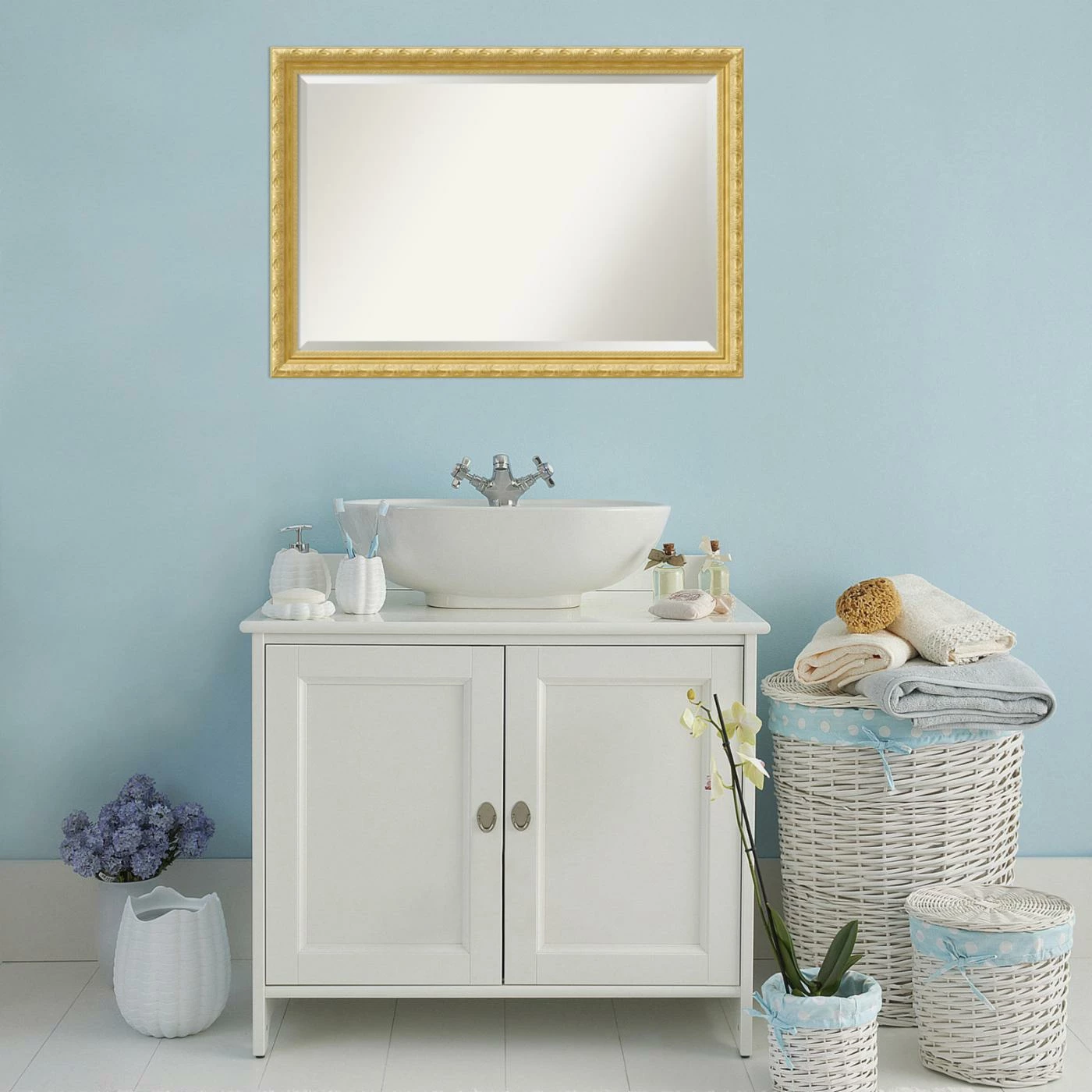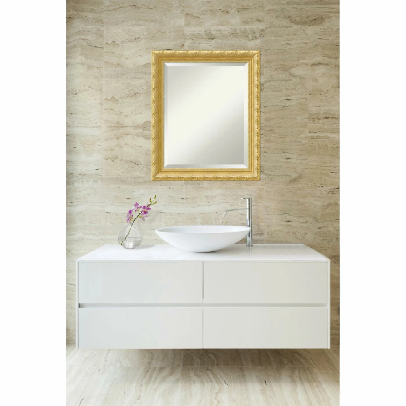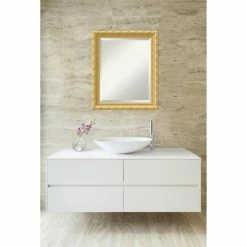 The Amanti Art Versailles Bathroom Mirror is the perfect way to update your bathroom in bright, luxurious style with its brilliant antique gold finish. Carvings around the sturdy wood frame give this bathroom mirror a European-inspired look and texture.