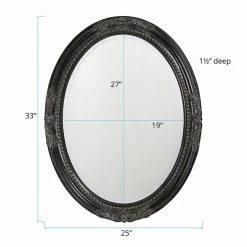 The Elizabeth Austin Queen Ann Wall Mirror allows you to adorn your wall with a glorious work of art. It features an oval wood frame with an ornately carved design and antique black finish. The inset oval mirror has a beveled edge, which adds depth and detail. With its refined elegance and stunning design, this mirror reflects your beautiful taste and sense of style. Hanging hardware is included. Weighs 23 lbs. Mirror dimensions: 27L x 19W inches. Overall dimensions: 33L x 25W x 2D inches.