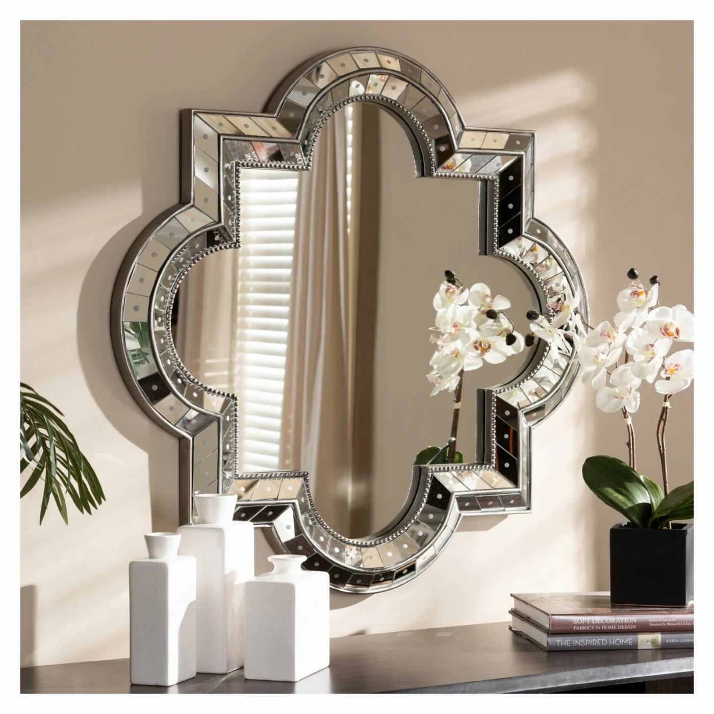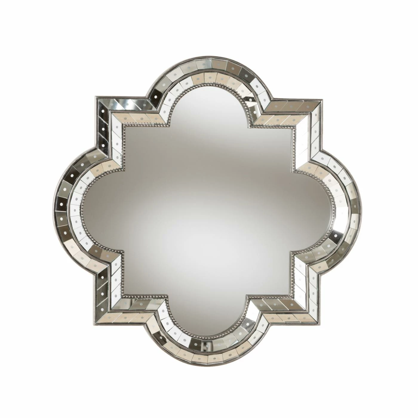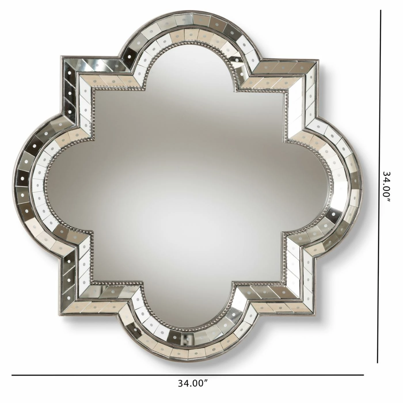 Infuse pure elegance into any space with the Baxton Studio Catia Quatrefoil Wall Mirror – 34W x 34H in., which boasts an impressive quatrefoil shape. This fetching and modern wall mirror boasts an antique silver finish with beaded details for a pop of texture. Angled, mirrored elements surround the frame to bring it a bright, reflective final touch.