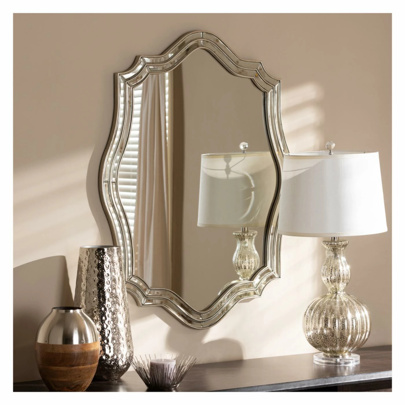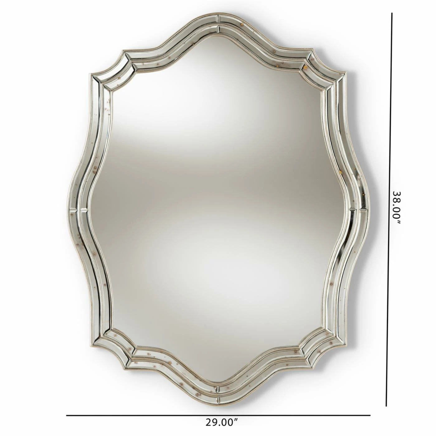Inspired by Baroque design, the Baxton Studio Isidora Wall Mirror – 29W x 38H in. boasts a curvaceous, romantic shape. Accented with two layers of mirrored sections, this unique wall mirror brings immediate brightness to any room. The sturdy yet slim frame is accented in a coordinating antique silver finish.