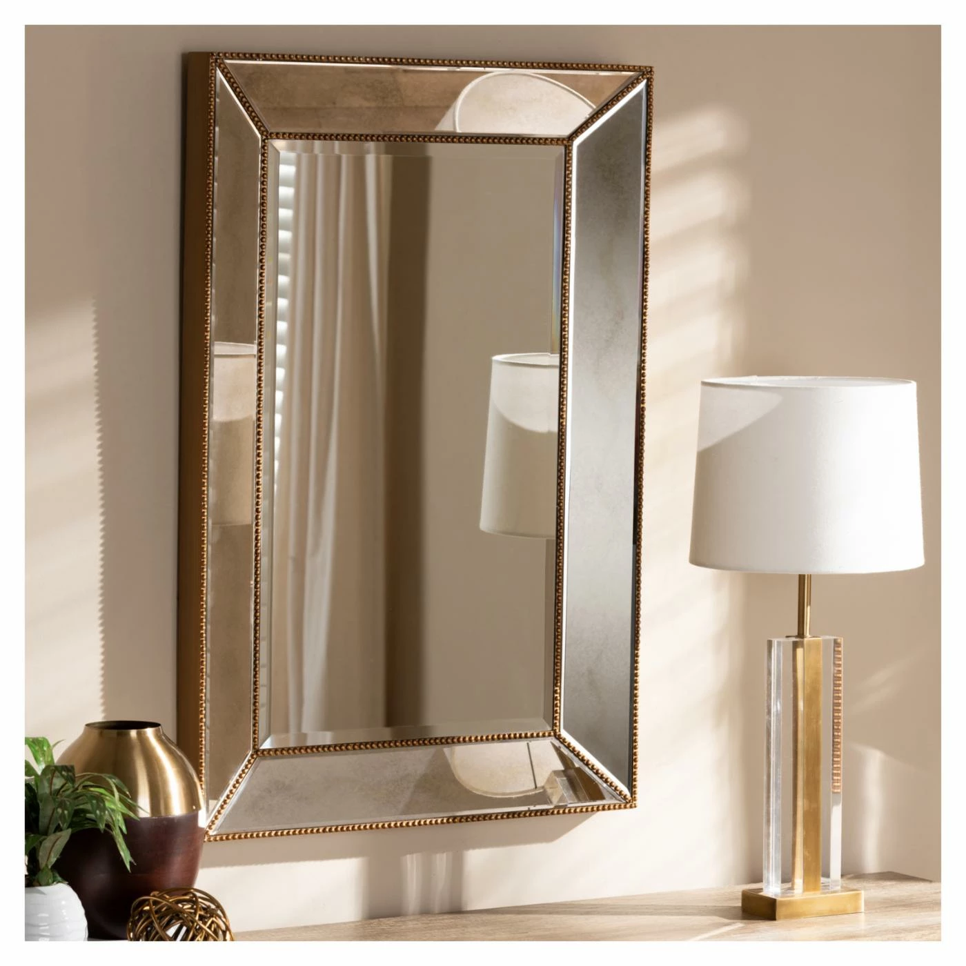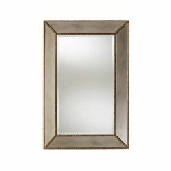- Beaded details and beveled mirror inlay