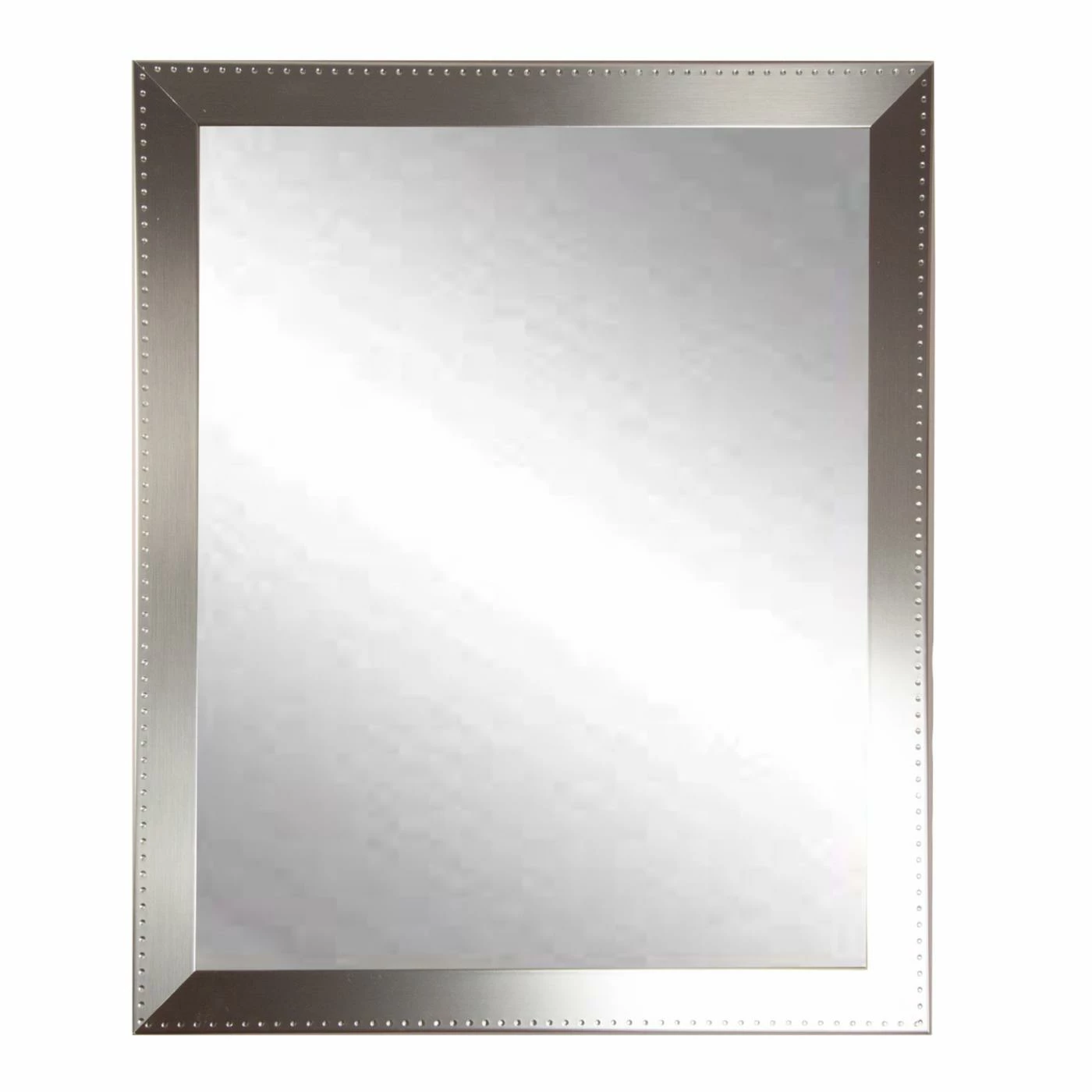 Brighten up your wall with the BrandtWorks Embossed Steel Wall Mirror, featuring a durable wood composite frame finished in a sleek silver with decorative rivet accenting. Non-beveled glass enhances the modern effect. Four hooks make it easy to hang vertically or horizontally.
