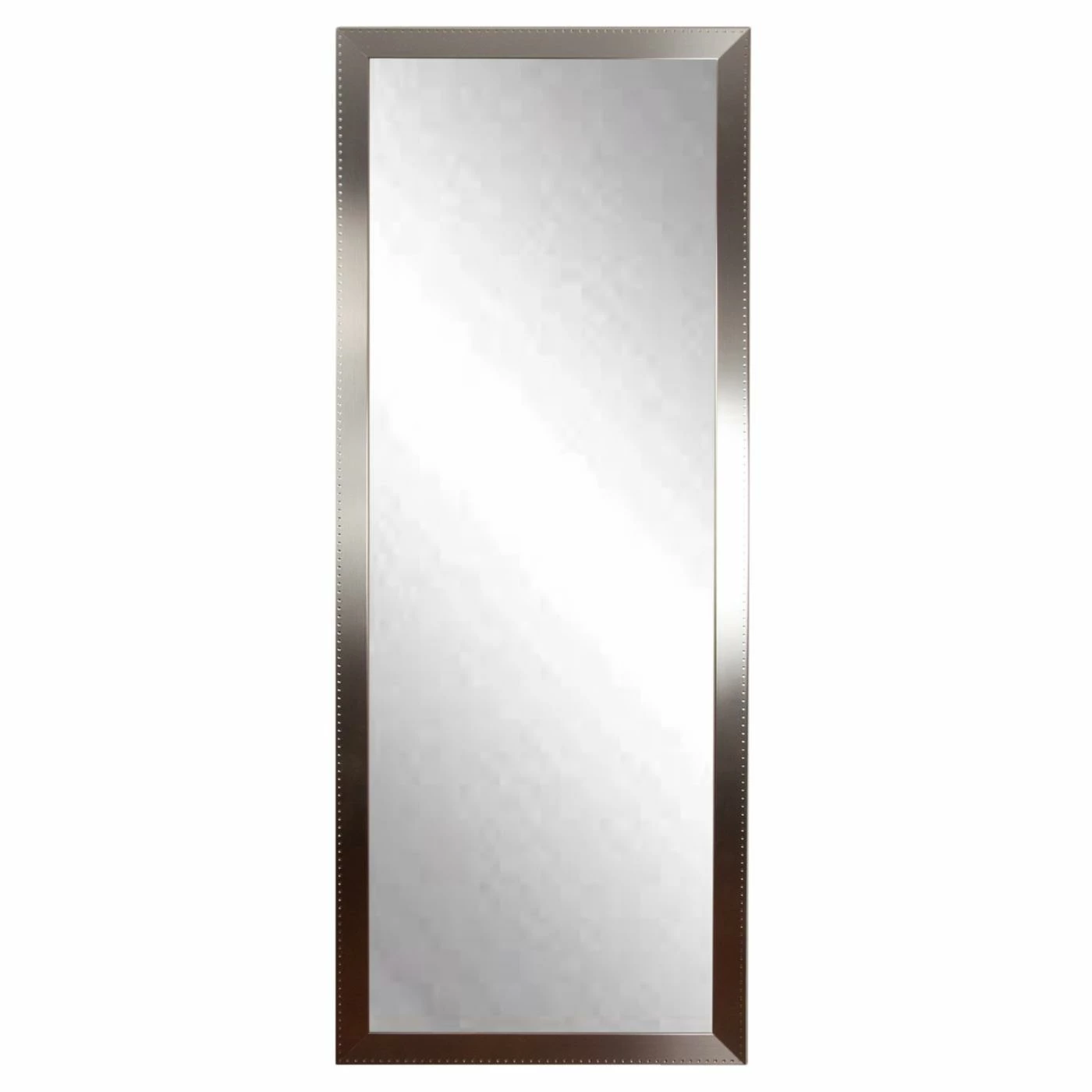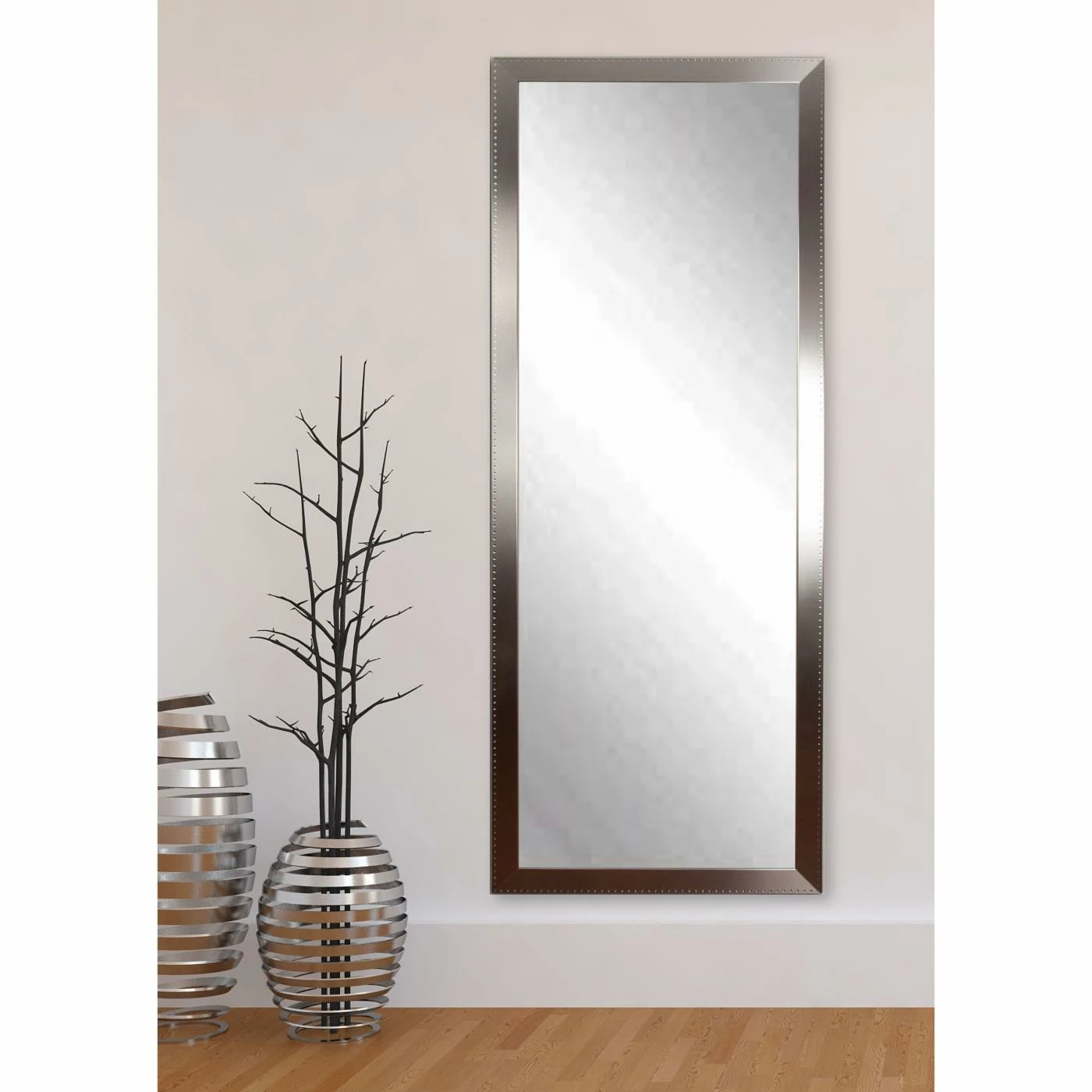 Decorate your walls with the BrandtWorks Modern Decor Collection Wall Mirror – 23.5W x 68.5H in. for a modern take on decorations. This oversized wall mirror is a streamlined rectangle made from engineered wood and mirrored glass. The frame is finished in a brushed metallic pewter with a subtle hammered detail around the edge. All the necessary hanging hardware is required, so you can get right to the easy installation. The mirror itself requires no assembly for your convenience.
