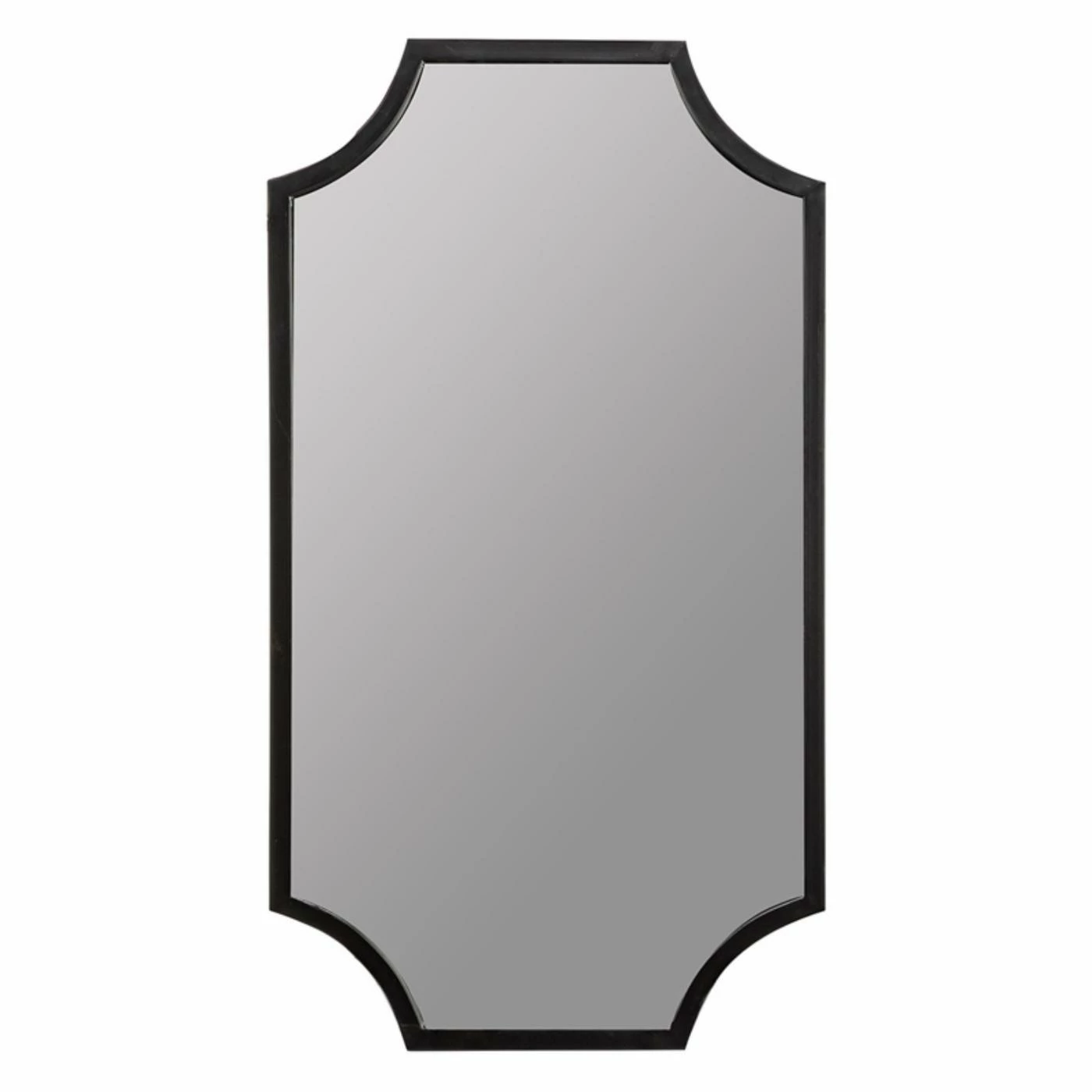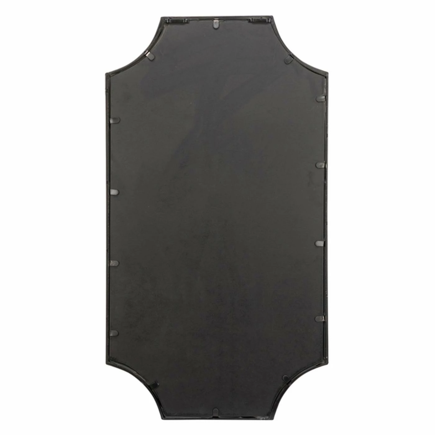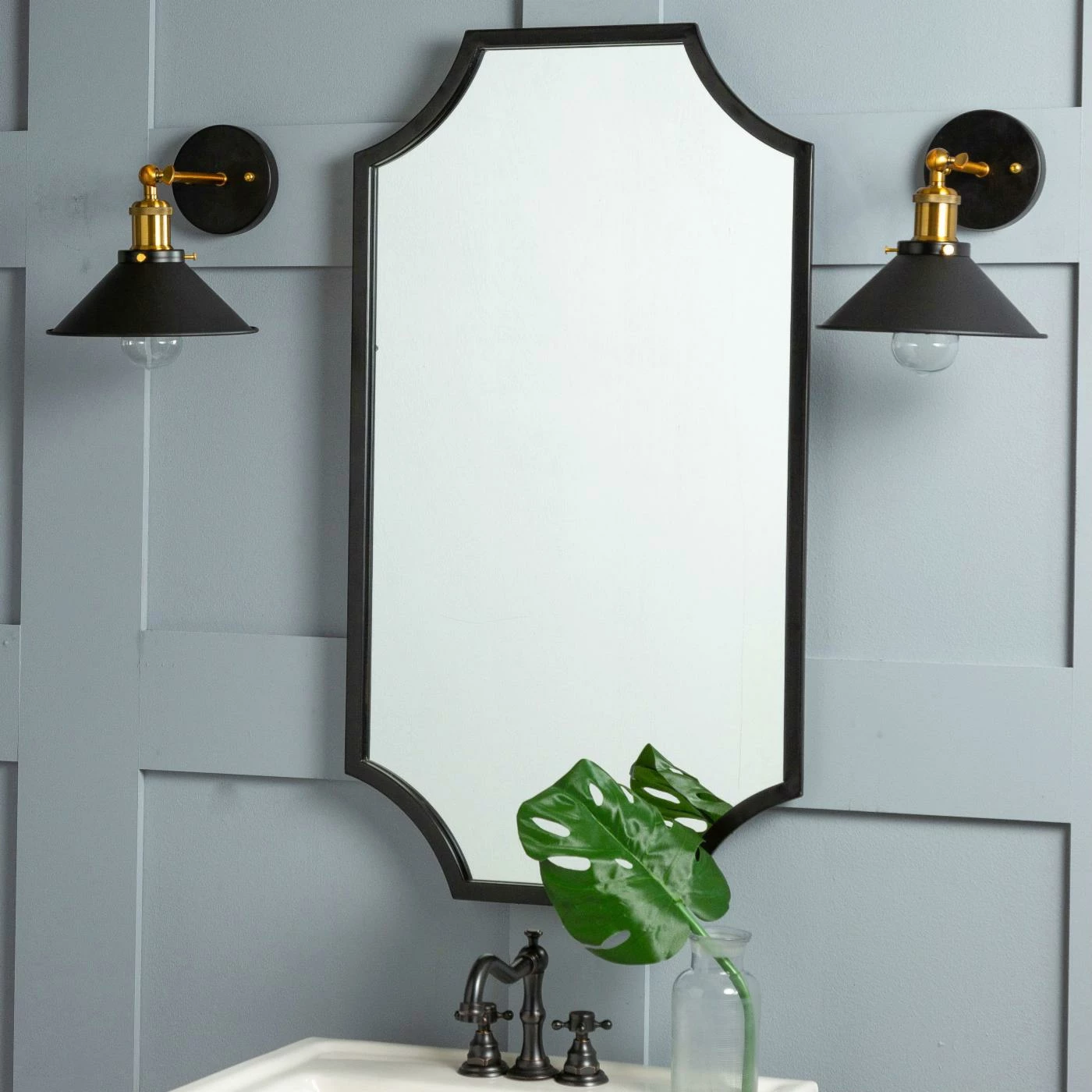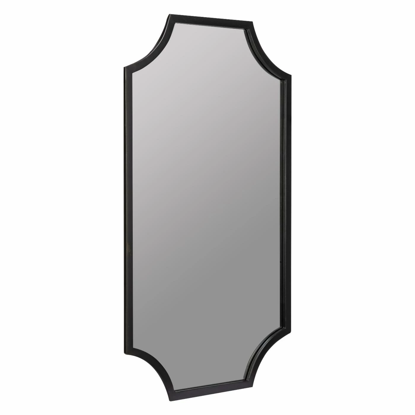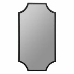 Update your bedroom or bathroom with the Cooper Classics Malone Wall Mirror – 20W x 36H in. for a bold modern wall accent. The mirror is supported by an engineered wood frame. A metal rim accents the piece, featuring a black finish and scalloped corners. The mirror surface itself is completely flat and free of beveling.