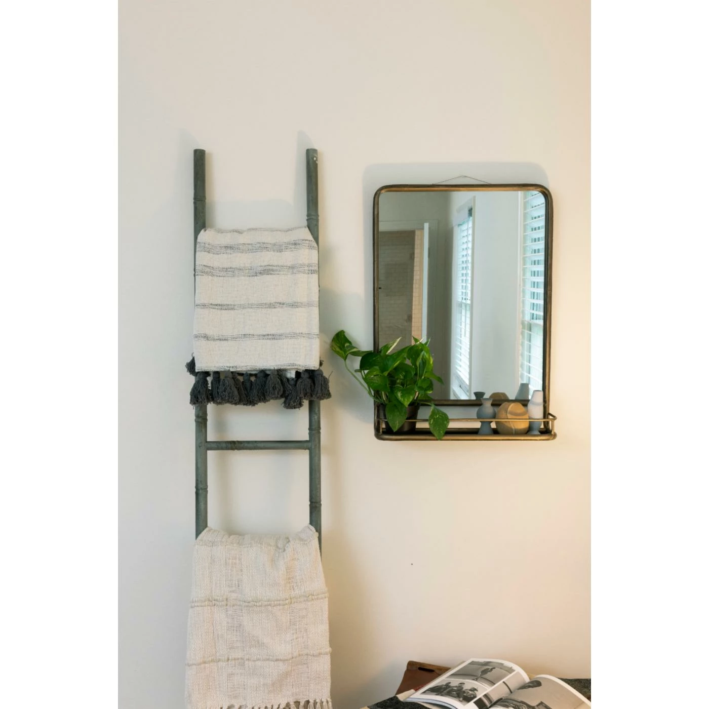 Hang some sleek and elegant appeal on your wall with this metal wall mirror . Durably made with a sturdy metal frame, this wall-mounted mirror has a handy shelf for displaying candles, photographs, decorative accents, holiday decor and more. More than a reflection, this Wall Mirror brings light and dimension to any room while adding a bright touch to the decor. This wall mirror has an industrial look that evokes 1940s America with curved grey pipe frames extending outward at the bottom to form a convenient shelf. In an office or living room, try a bud vase and other display items to soften the factory feel.