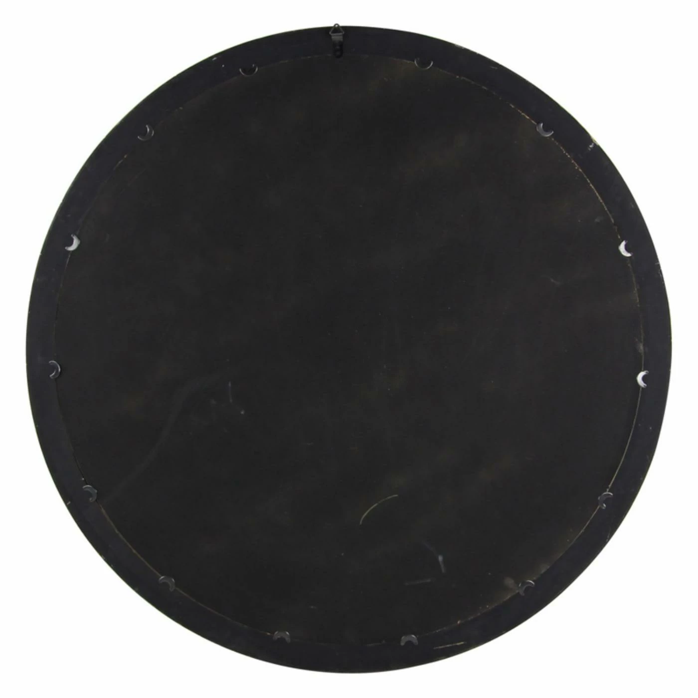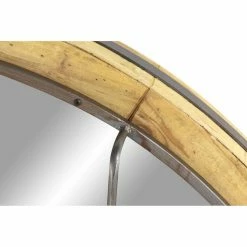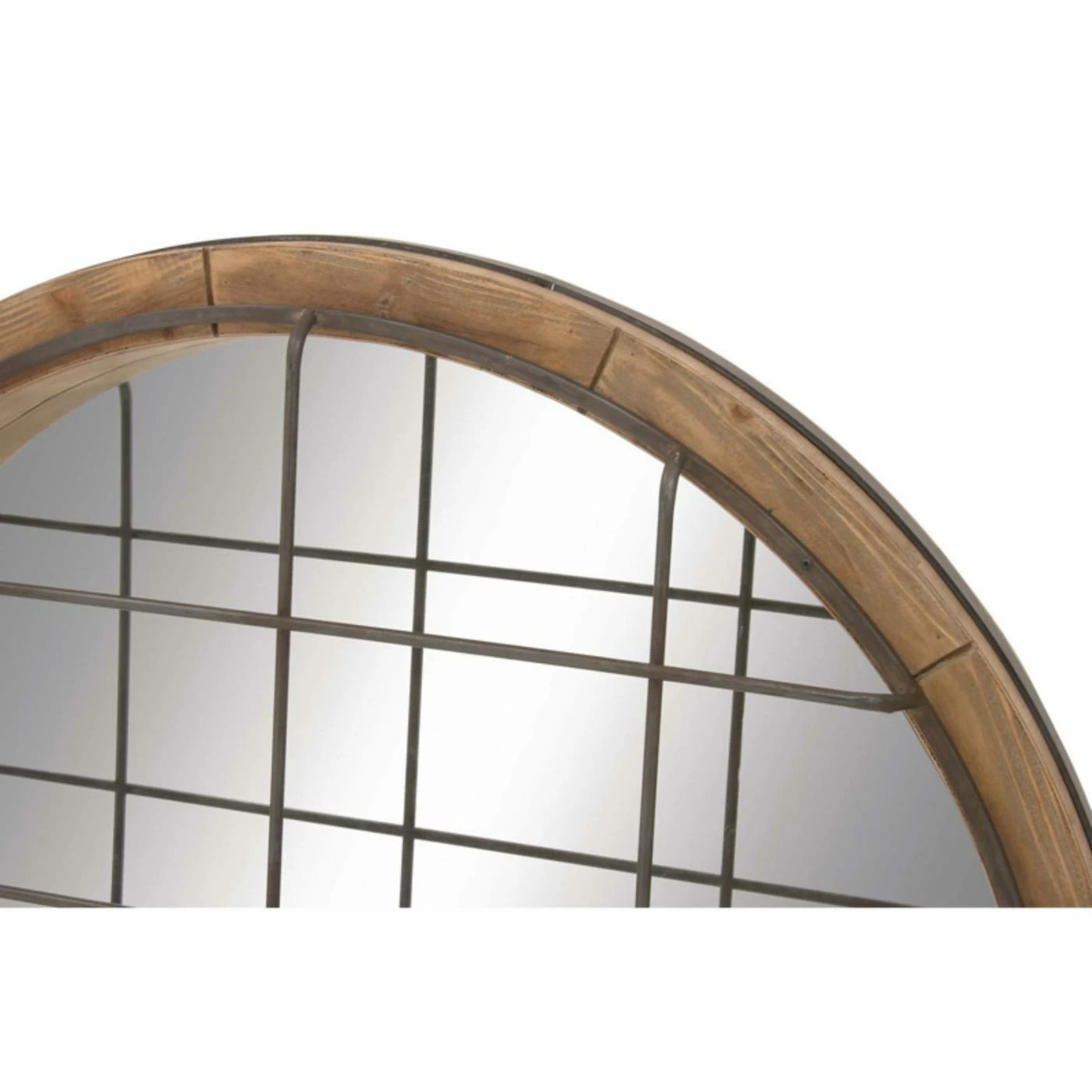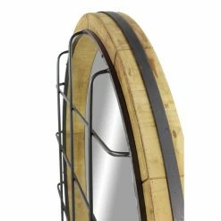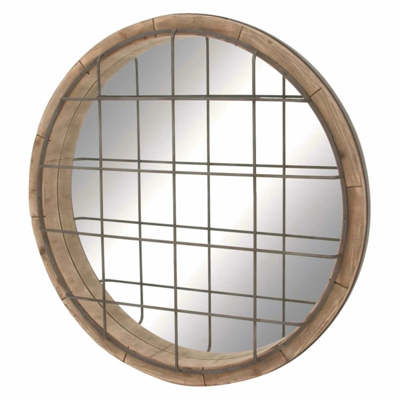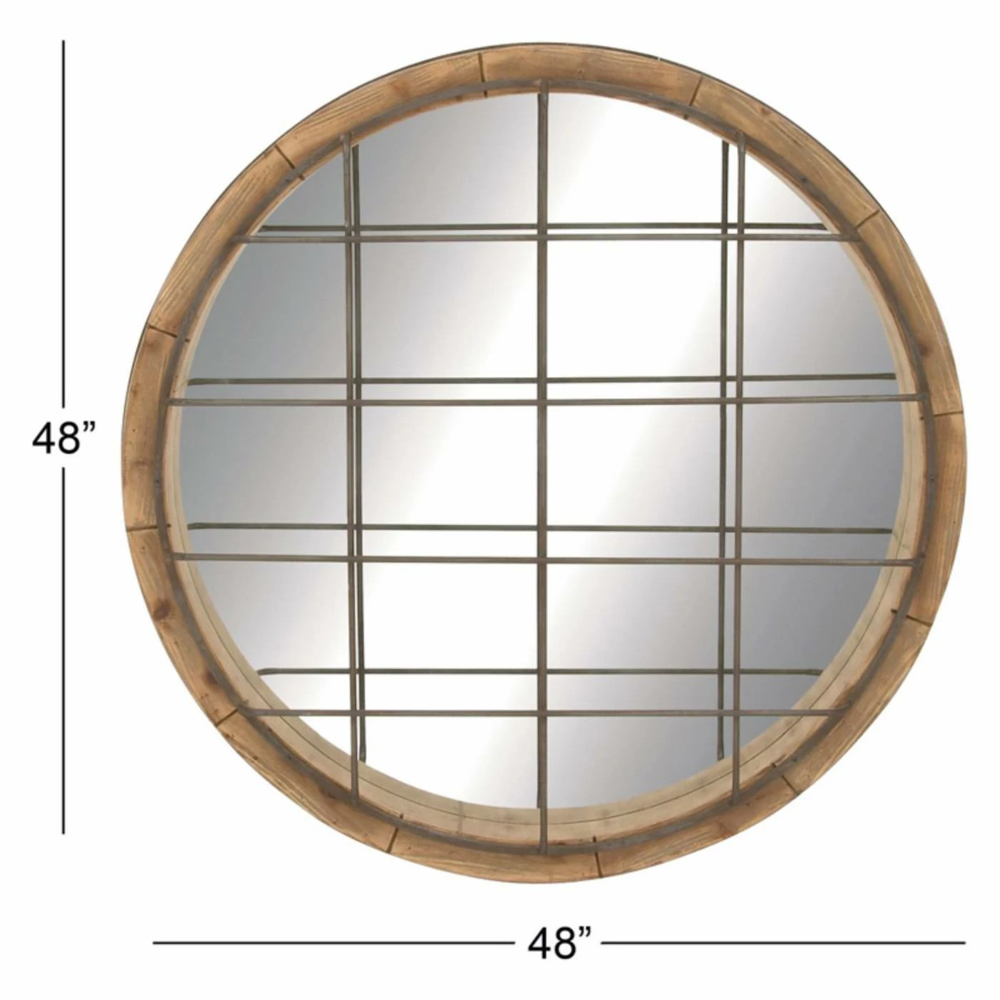 The large, round shape of the DecMode 48 in. Round Wall Mirror combines with stark, lines of iron bars to make a small room feel larger or add character to your space. This glass wall mirror has a reclaimed Chinese fir wood frame in a light beige hue, providing softness and contrast to the cage-like, black wrought iron grill. The back is reinforced with engineered wood. Use this mirror to update your rustic or farmhouse dΓ©cor.