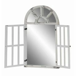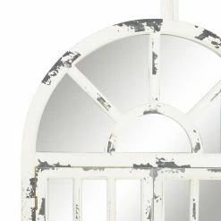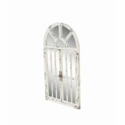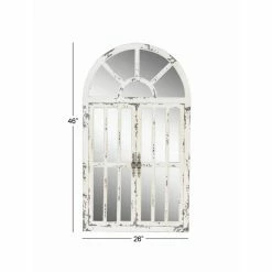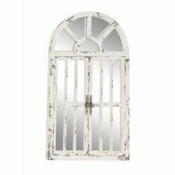 Add some antique architectural flair to your decor with the DecMode Distressed White Wooden Arched Window Wall Mirror – 26W x 46H in. The heavily distressed white wooden frame and lattice gives the mirror the look of a window that has been weathered by time. Two decorative floral knobs enhance the visual effect, making it seem as if the wood can swing open.