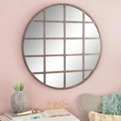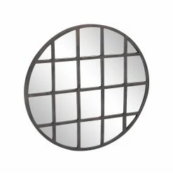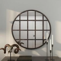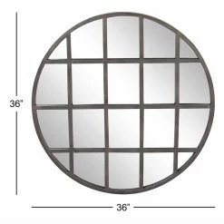 Bring rustic style to your wall with the DecMode Iron and Wood Round Paneled Glass Wall Mirror – 36W x 36H in. The circular iron frame holds 20 mirrored glass panels backed with sturdy wood.