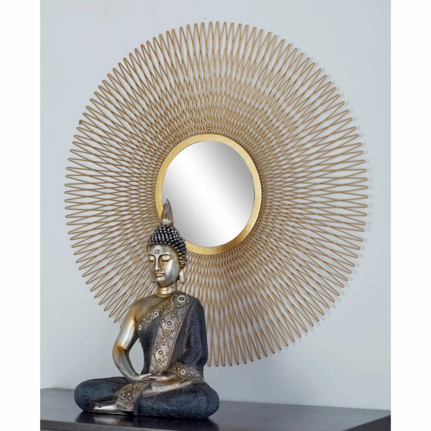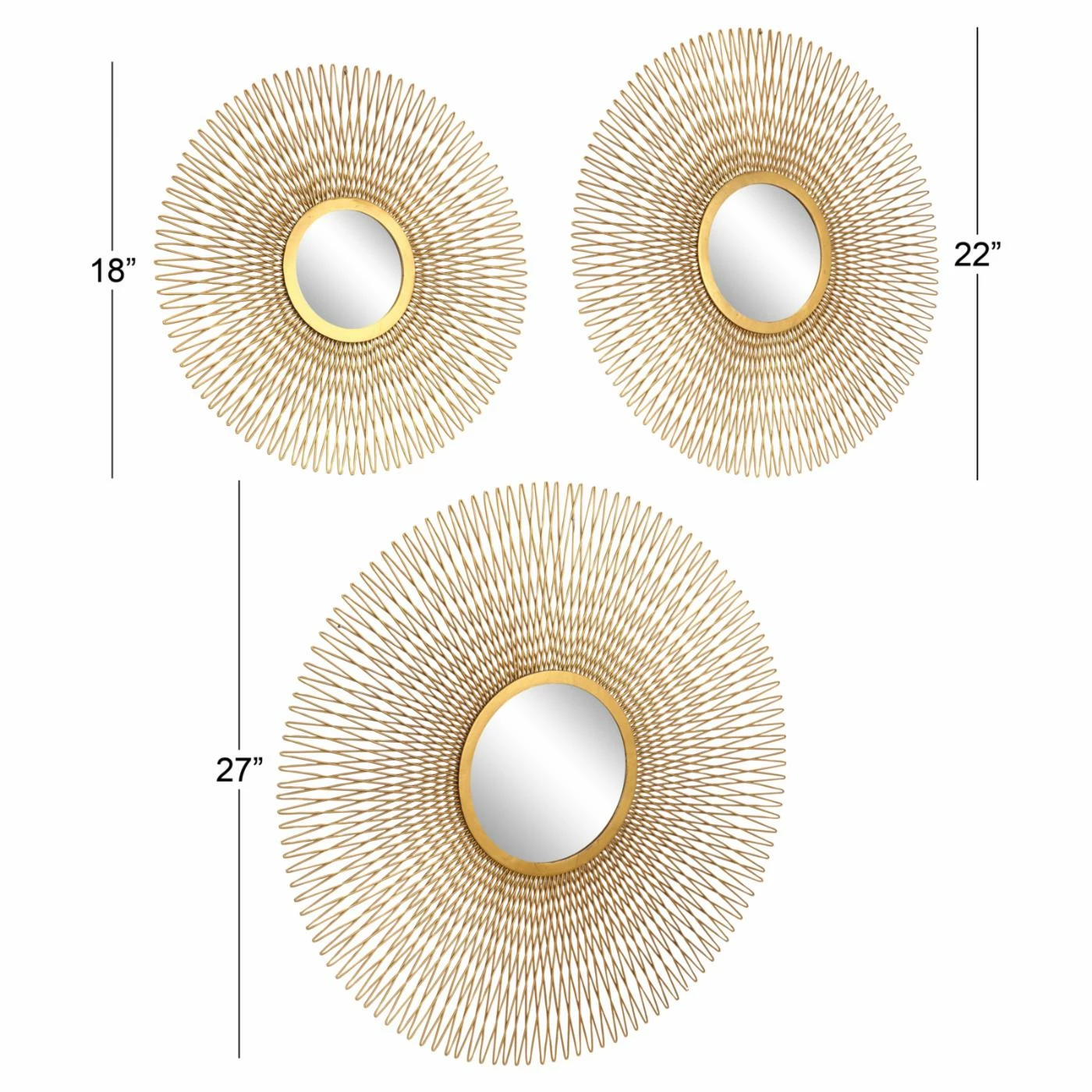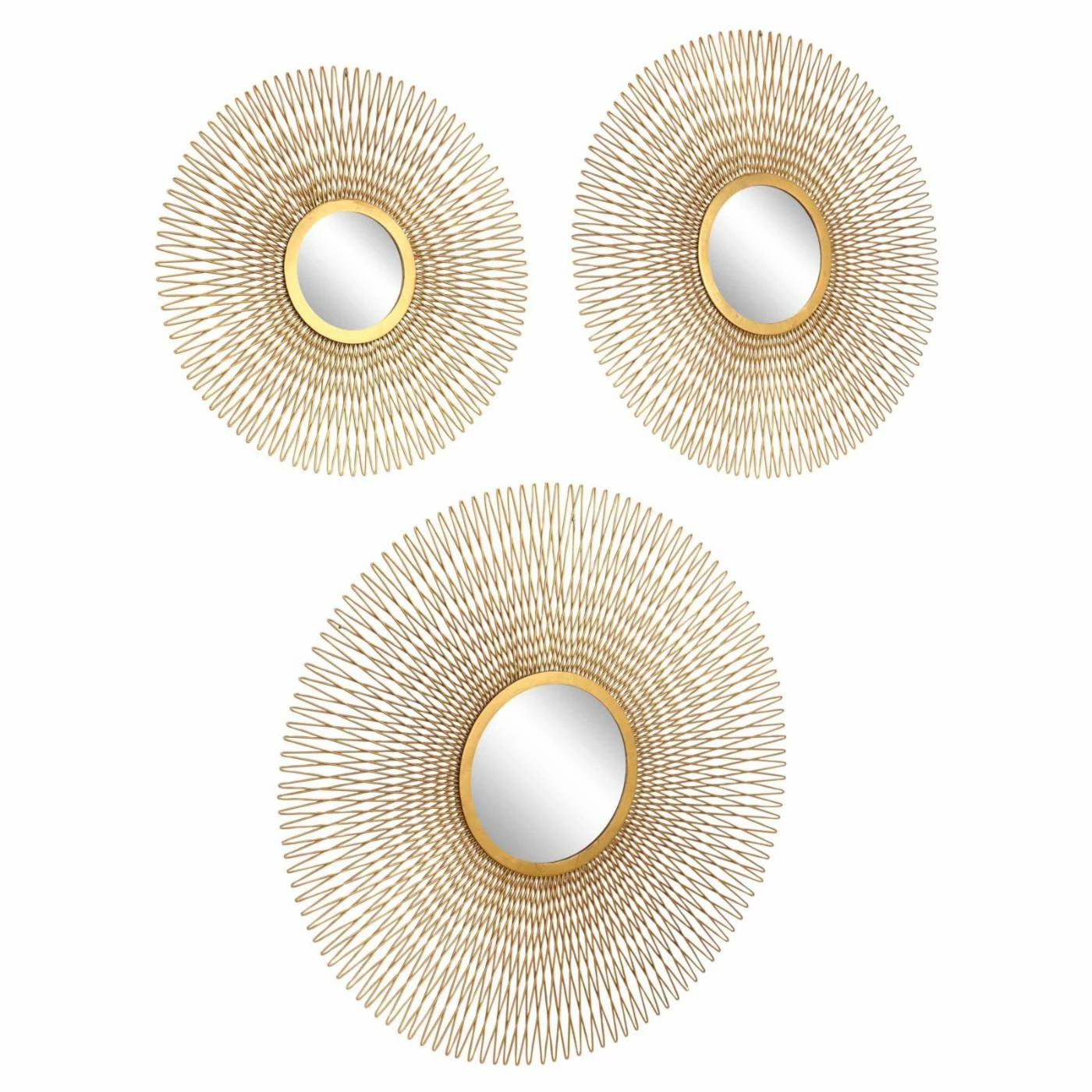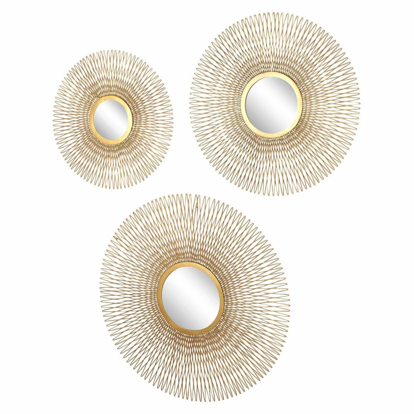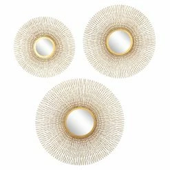 Spice up your modern decor with the DecMode Tin and Glass Round Gold Wire Sunburst Wall Mirrors – Set of 3. The set provides three sunburst round mirrors with richly colored gold-finished tin frames.