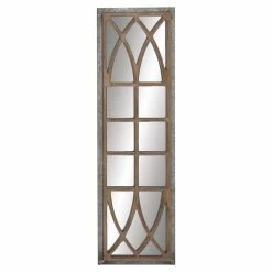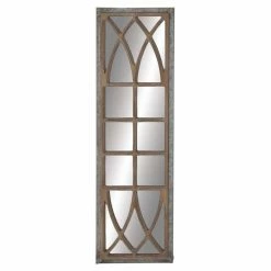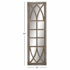 An intricate wood lattice design gives the DecMode Wood Window Inspired Framed Wall Mirror – 15W x 52H in. the look of an aged window frame. Galvanized iron trim enhances the timeworn appeal of the piece.
