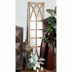 An intricate wood lattice design gives the DecMode Wood Window Inspired Framed Wall Mirror – 15W x 52H in. the look of an aged window frame. Galvanized iron trim enhances the timeworn appeal of the piece.