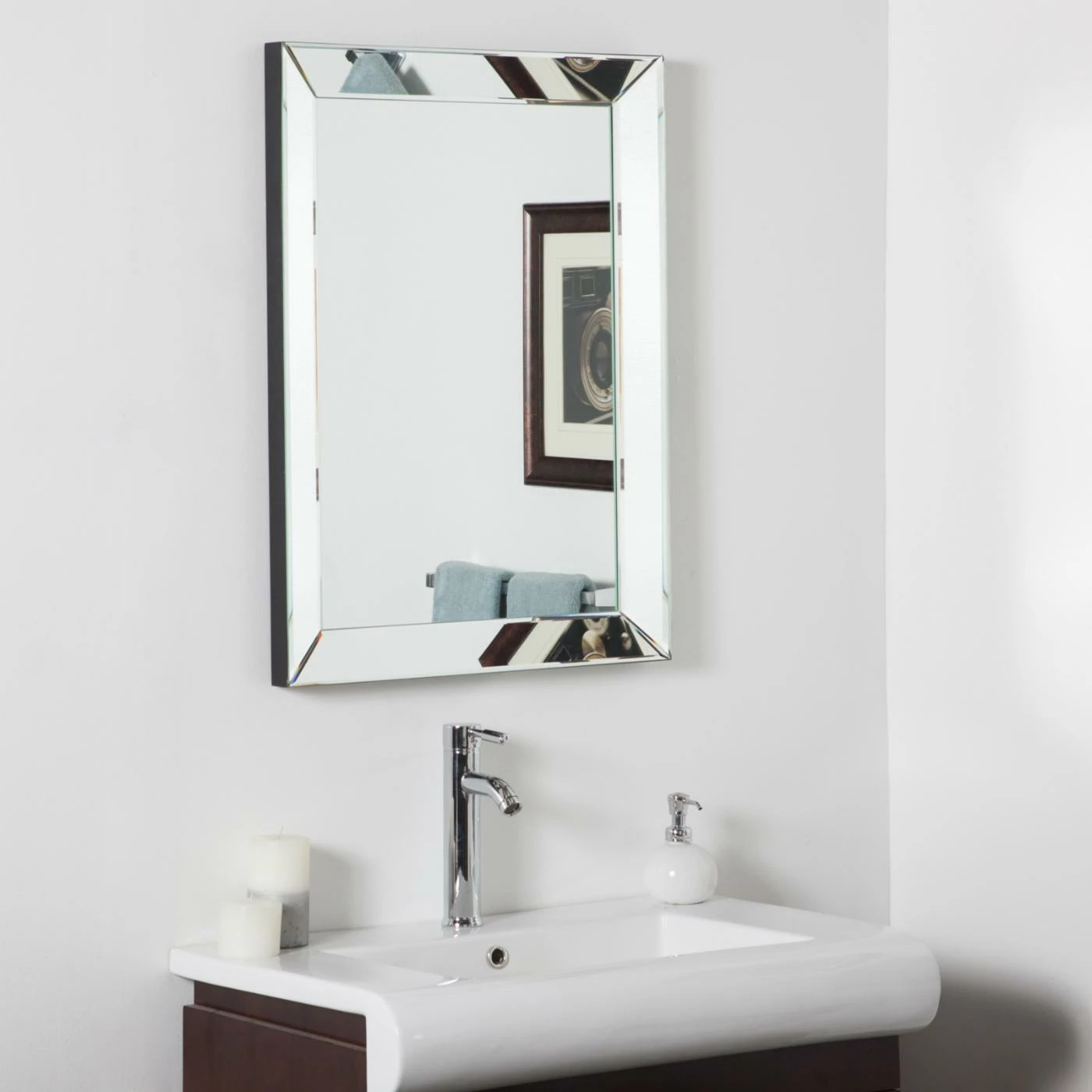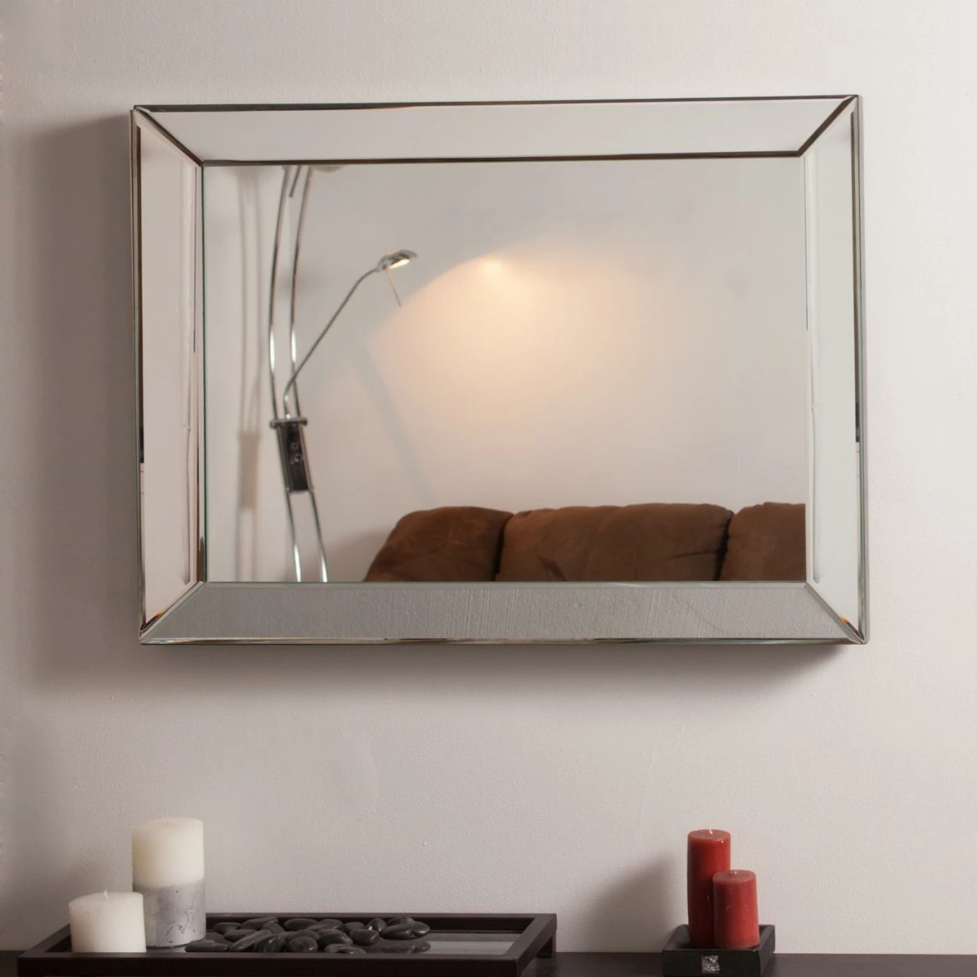 The Modern Framed Wall Mirror – 24W x 32H in. is a sleek design with heavy bevel and brilliant frame of four more hand-cut mirrors. This highly reflective mirror is great for brightening any room and it comes ready to hang with mounting hardware that allows you to display vertically and horizontally.