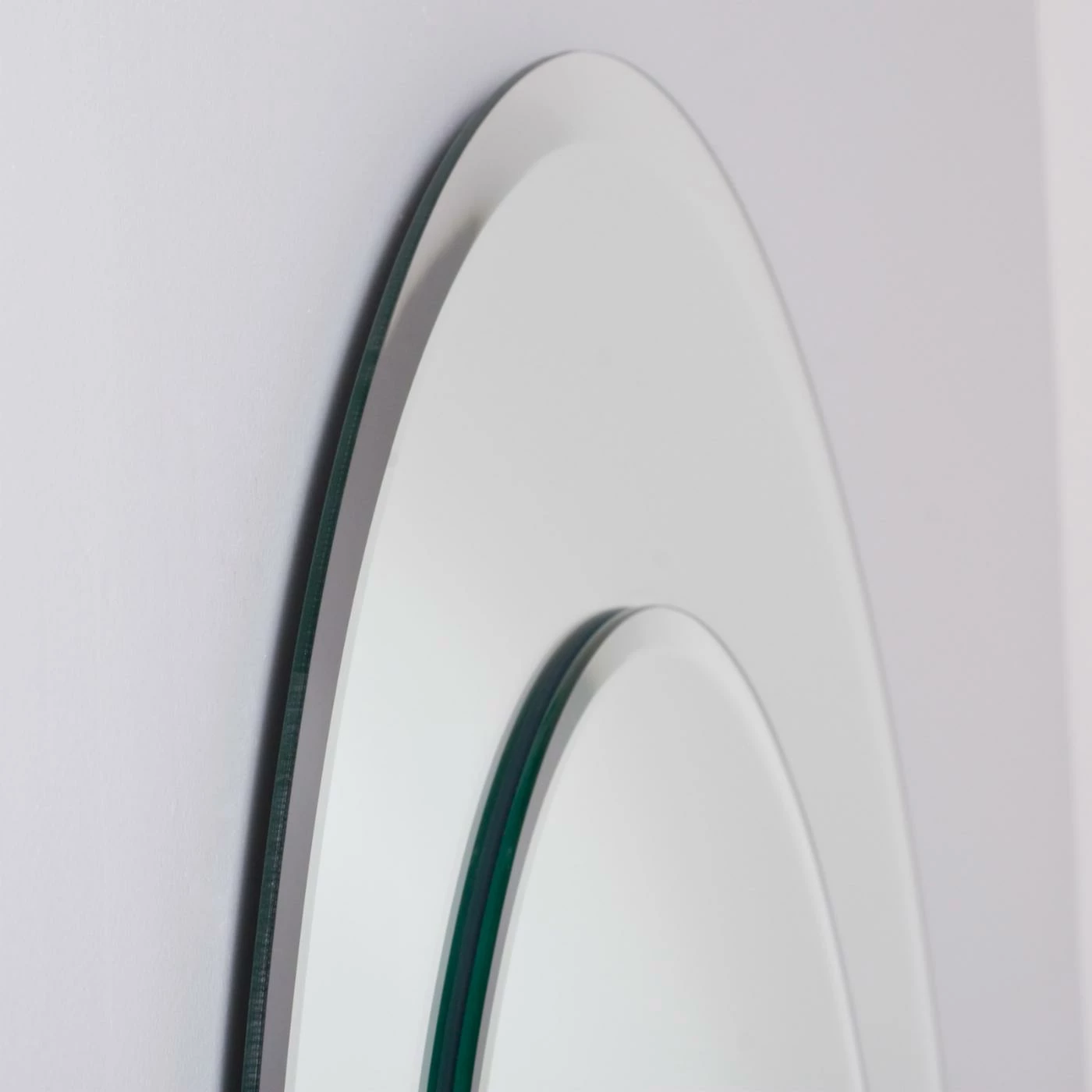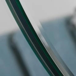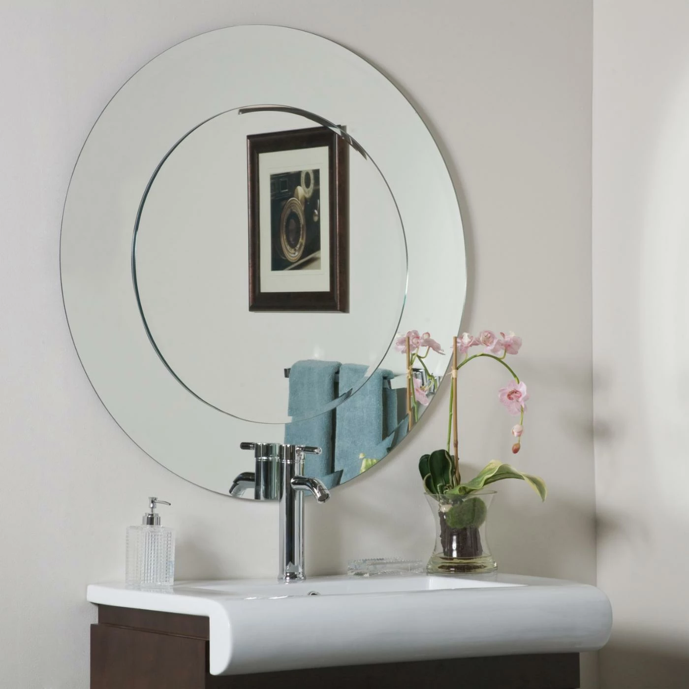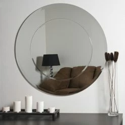 Enhance any room with the Oriana Modern Frameless Bathroom Mirror. This mirror’s classic round shape features two layers of thick 3/16 glass and metal. It features a 1 inch outside bevel and 1/2 inch inside bevel. It also includes a double coated silver backing with seamed edges for added durability. All necessary mounting hardware is included to hang vertically or horizontally.