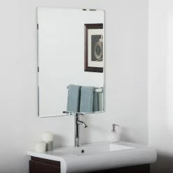 The Vera Frameless Bathroom Wall Mirror. takes a traditional design and gives it an exciting update that sees the restrictive frame replaced by a fetching .5-inch beveled edge and smoothly rounded corners. While the name implies use in the lavatory, that’s merely a suggestion. This elegant wall accent is perfectly suited for the hallway, living area, or master bedroom. Includes mounting hardware for hanging vertically only.