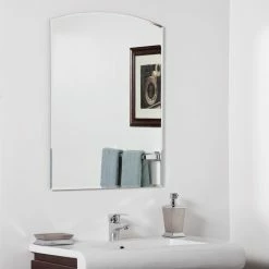 Elegant simplicity comes to your bathroom with the Dรฉcor Wonderland Katherine Modern Bathroom Mirror – 23.6W x 31.5H in. This frameless mirror features a rectangular design with an arched top and beveled edges. It is crafted from thick quality glass and is double-coated with a silver backing for a pristine reflection. This bathroom mirror easily mounts to the wall and makes a great addition to the vanity or sink area.
