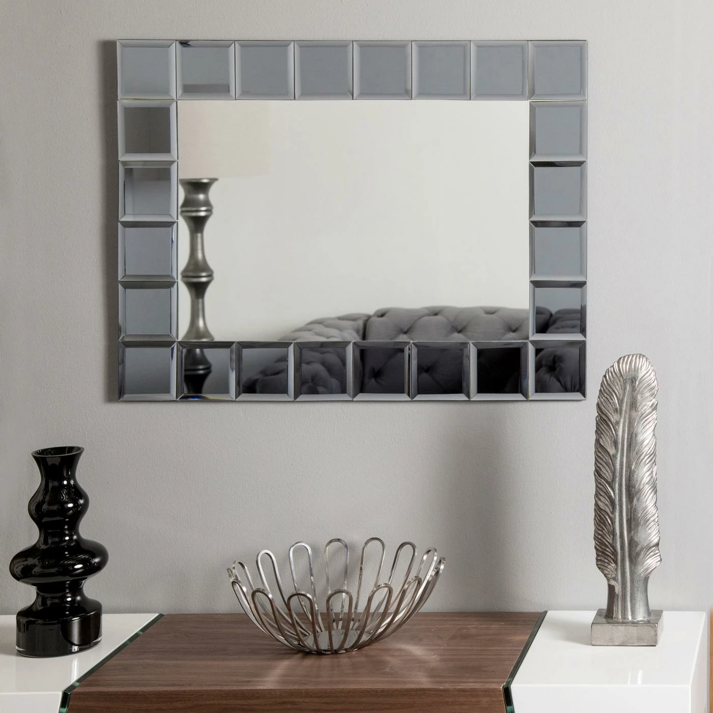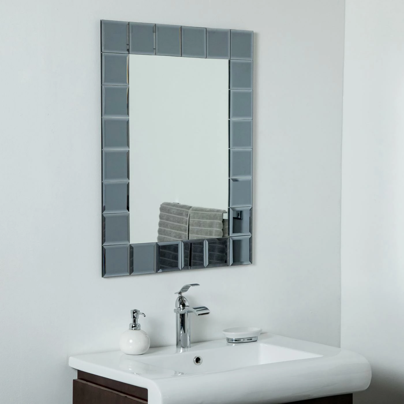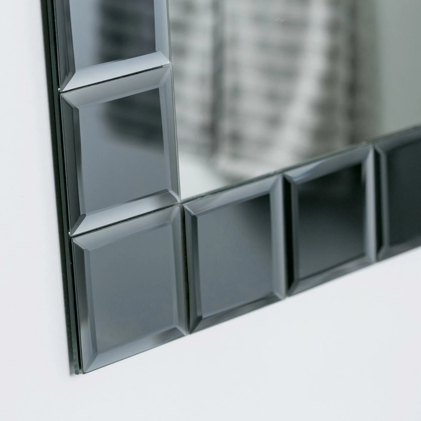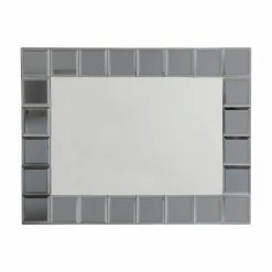 - Center mirror is framed with 4 in. gray square mirrors with V-groove and beveling details