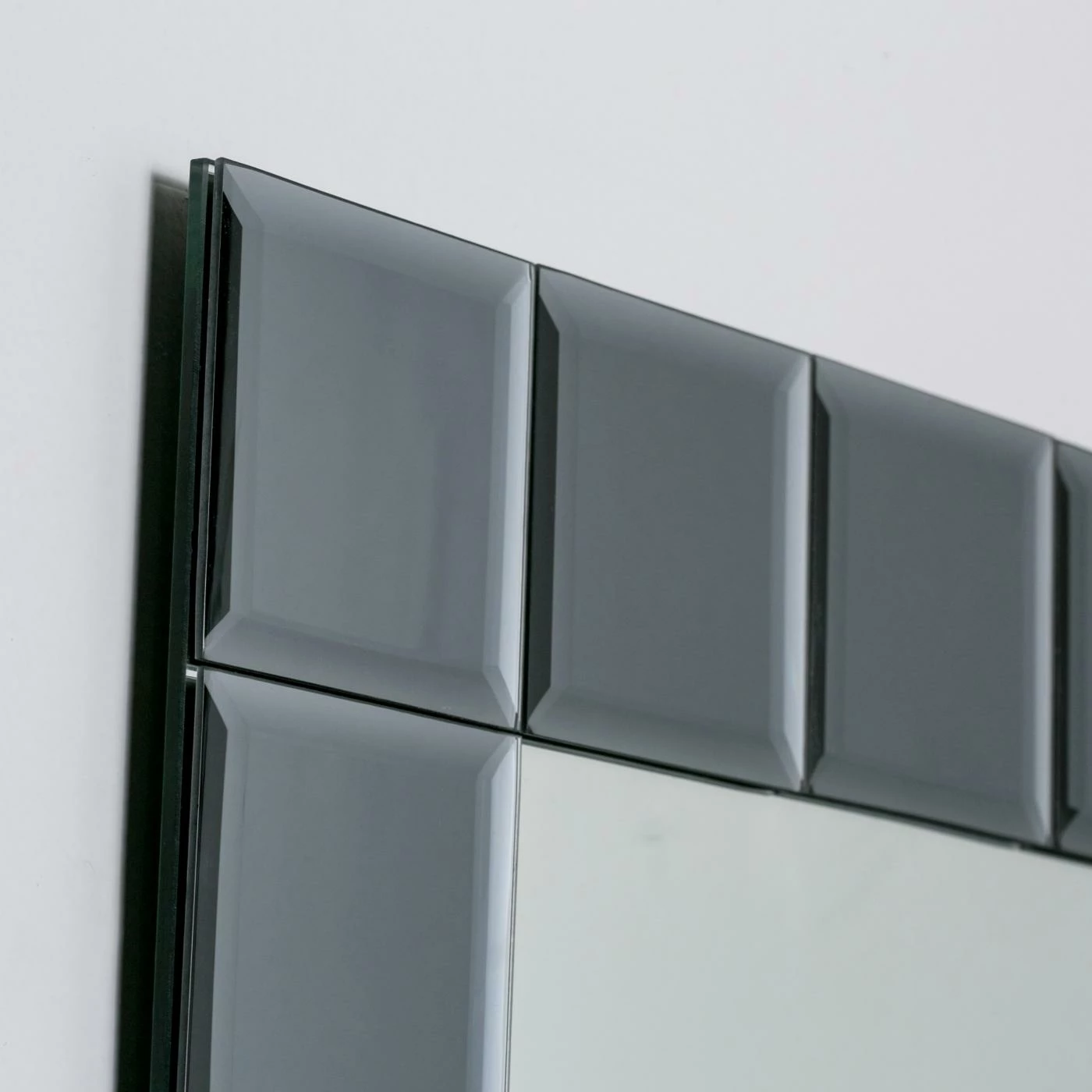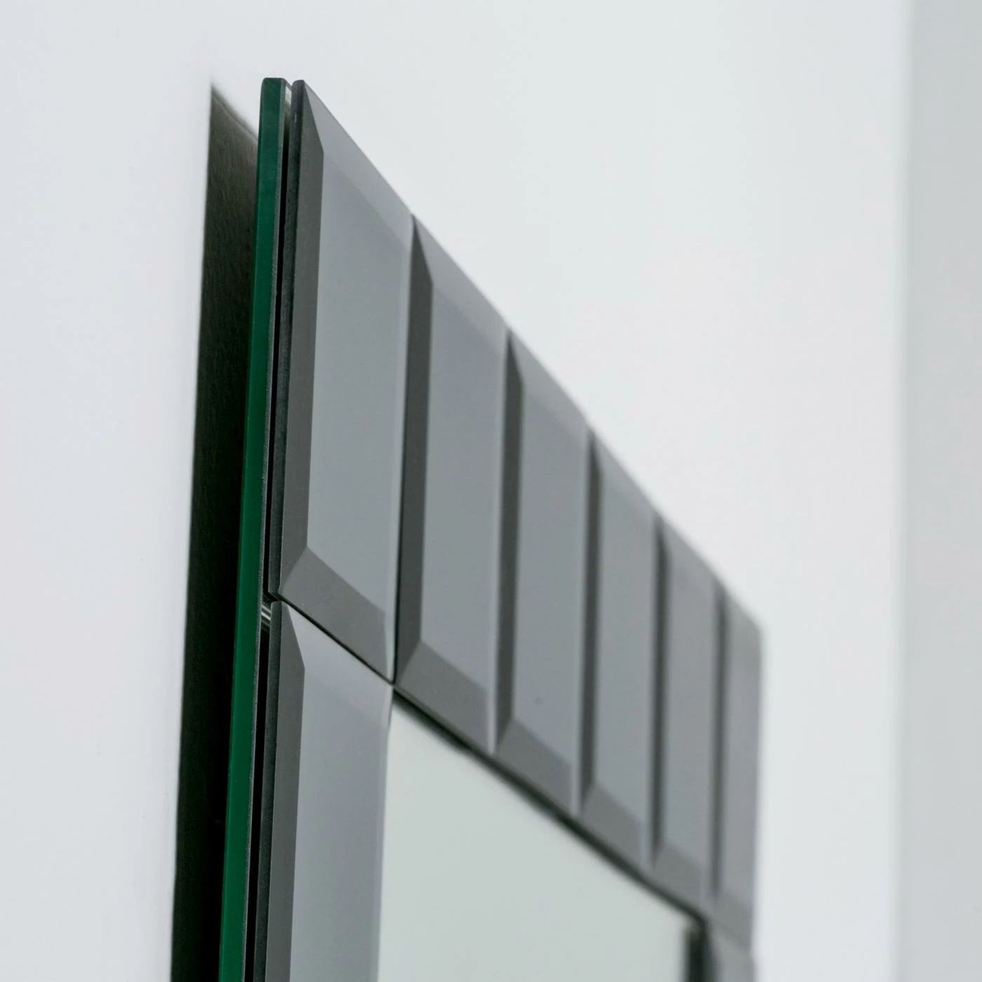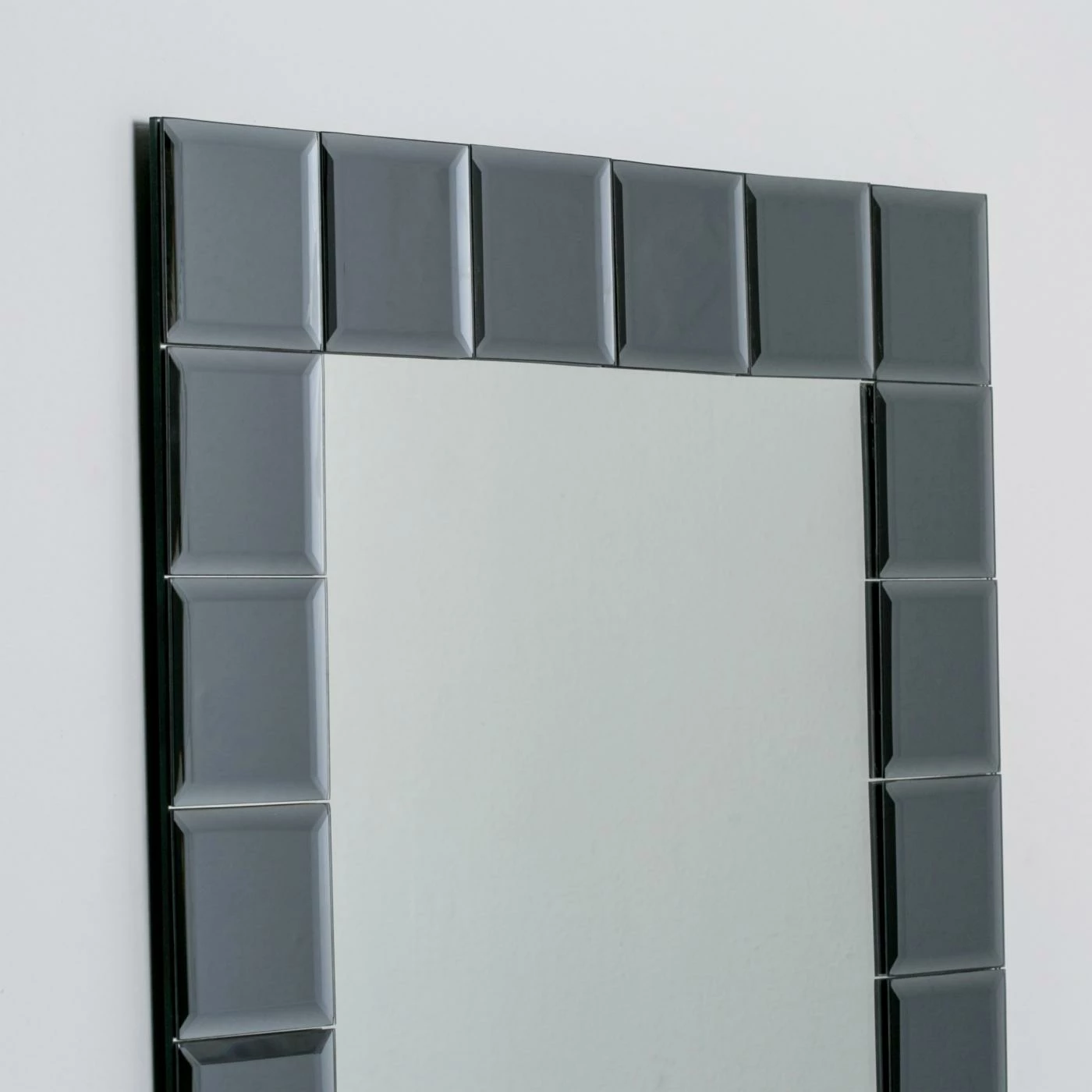 - Center mirror is framed with 4 in. gray square mirrors with V-groove and beveling details