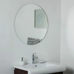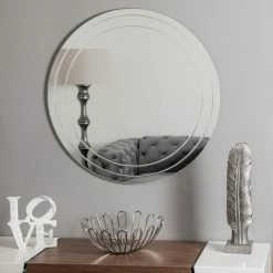 Lend your space a fetching and modern accent with the Decor Wonderland Turner Round Frameless Wall Mirror – 30 diam. in.. This chic wall mirror features beveled trim and two V-groove etches for a sleek aesthetic. Its sturdy silver mirror construction is equipped with mounting hardware for an effortless installation.