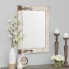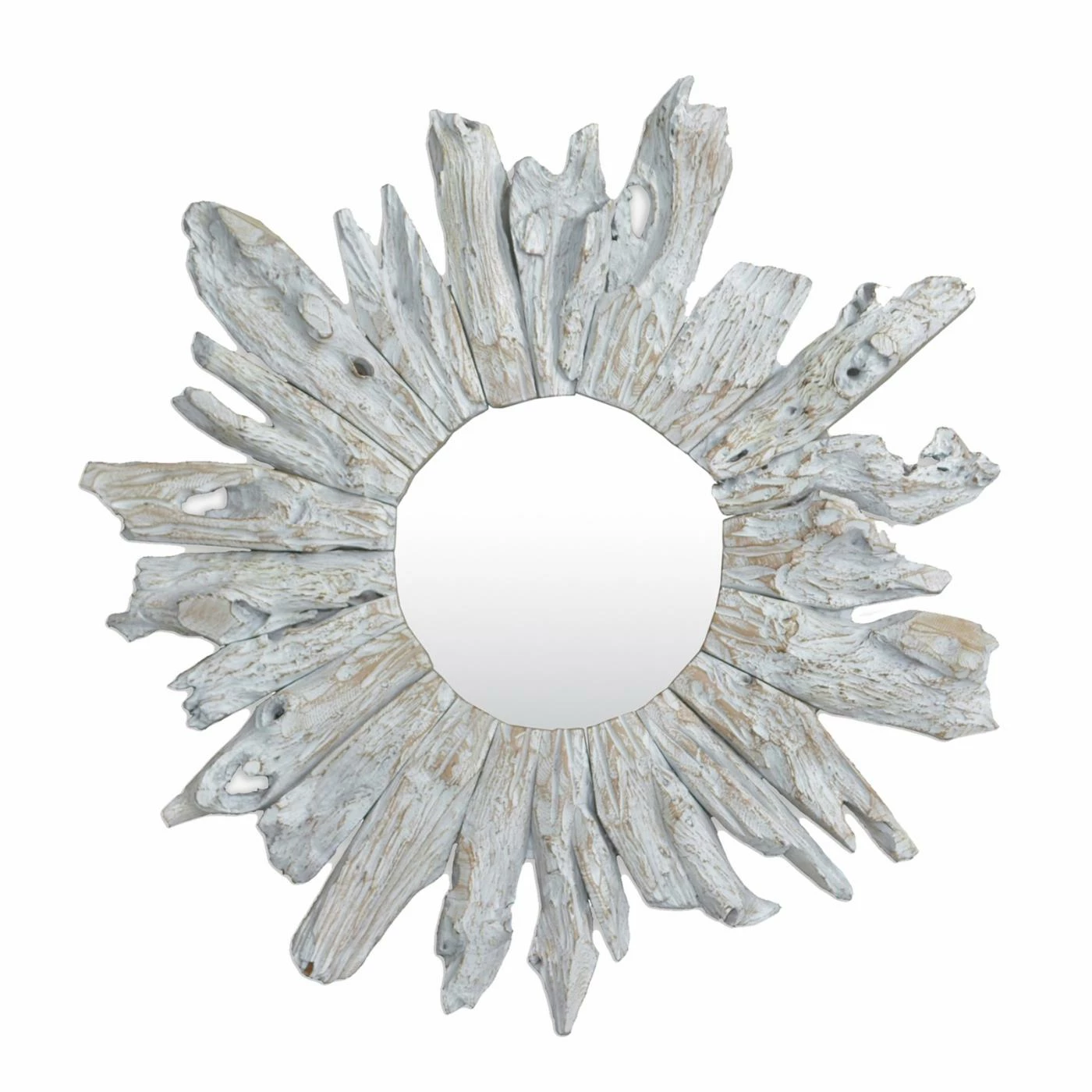 Rugged fragments of mahogany wood encircle the East At Main Vera Wall Mirror – 35 diam. in., forming a protective frame. Weathered white finishing keeps this round mirror looking bright and fresh on your wall.