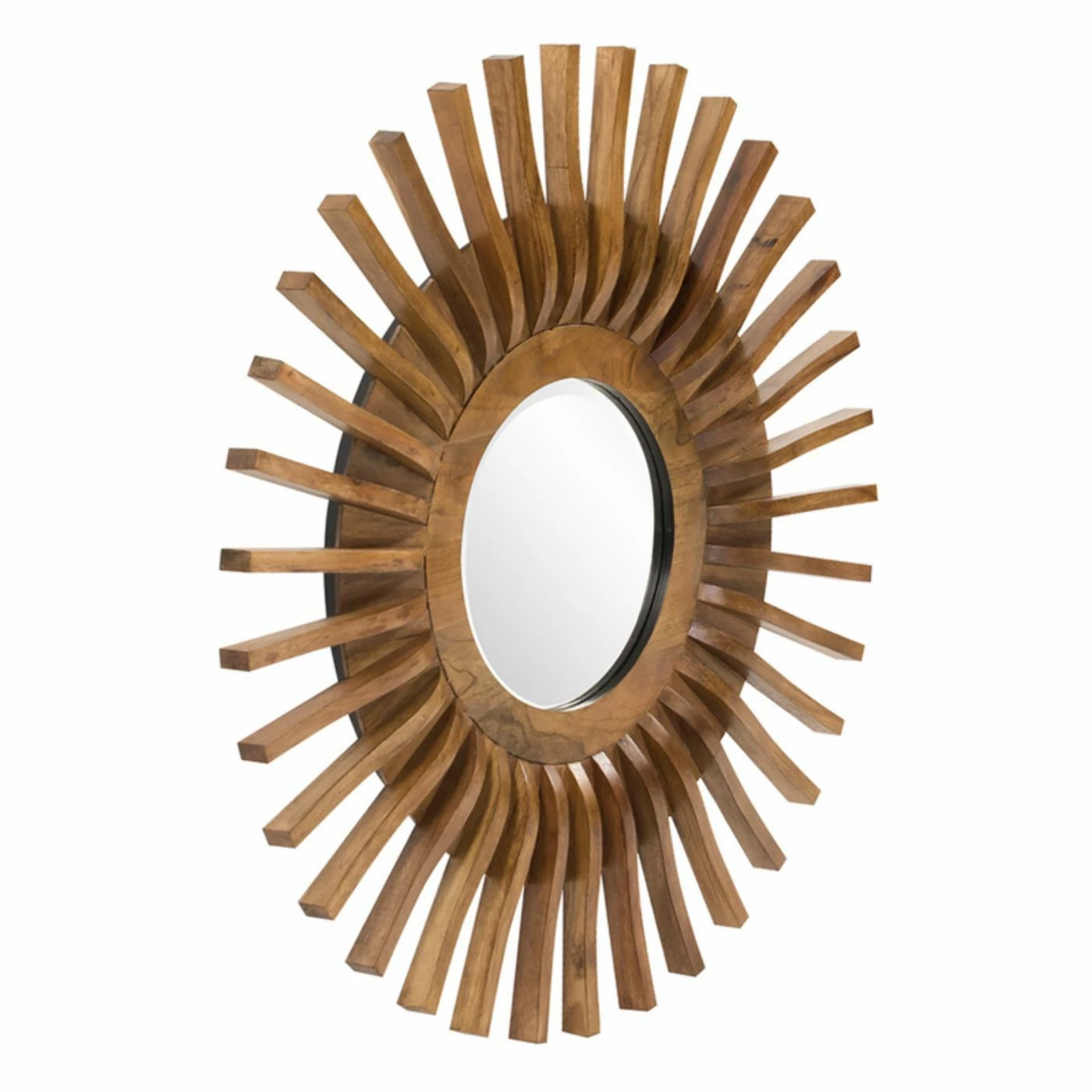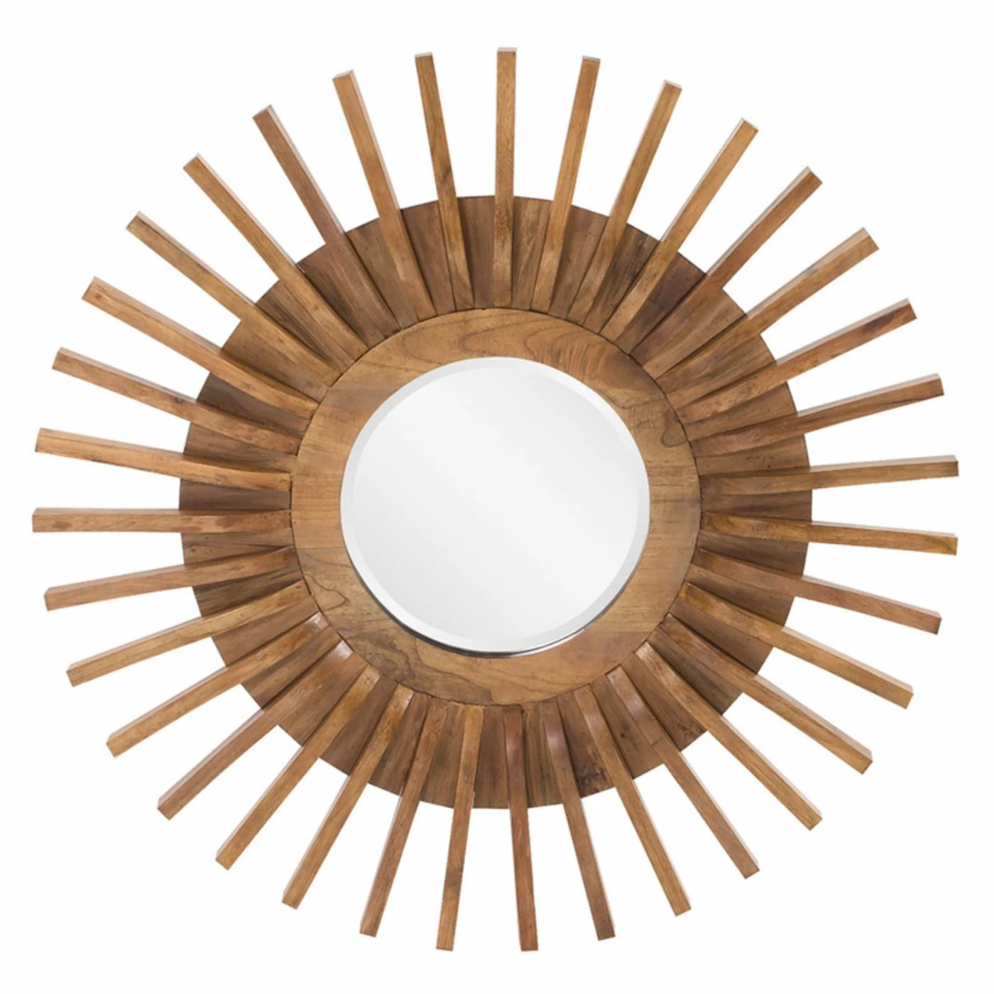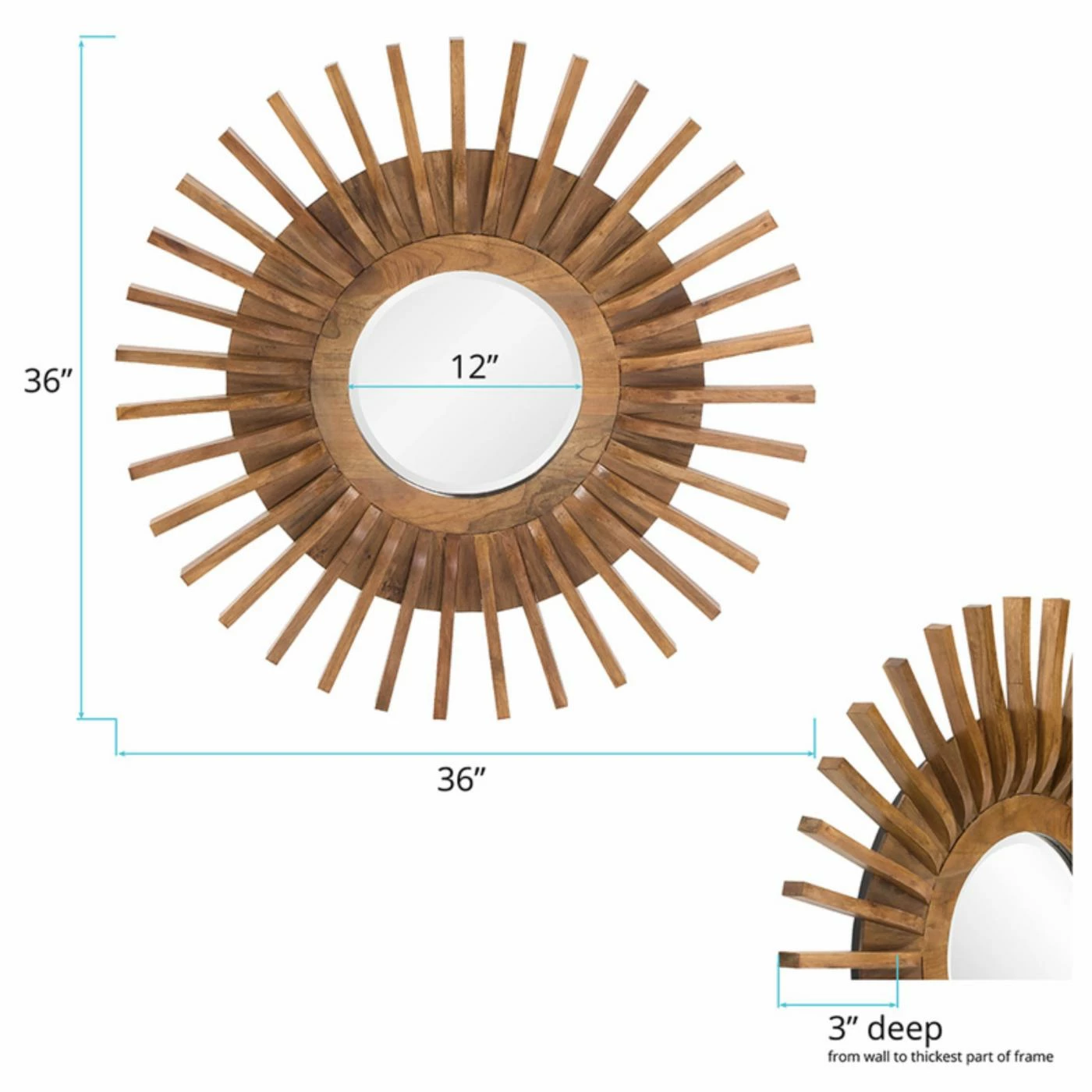 The Elizabeth Austin Carver Wall Mirror – 36W x 36H in. brings an organic touch to your home dΓ©cor. This au natural wall mirror is crafted of durable wood. It features a sunburst design that adds a high-end touch to its appearance.
