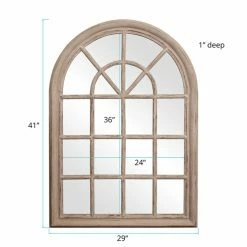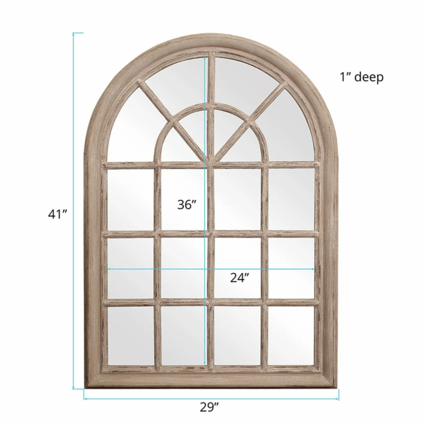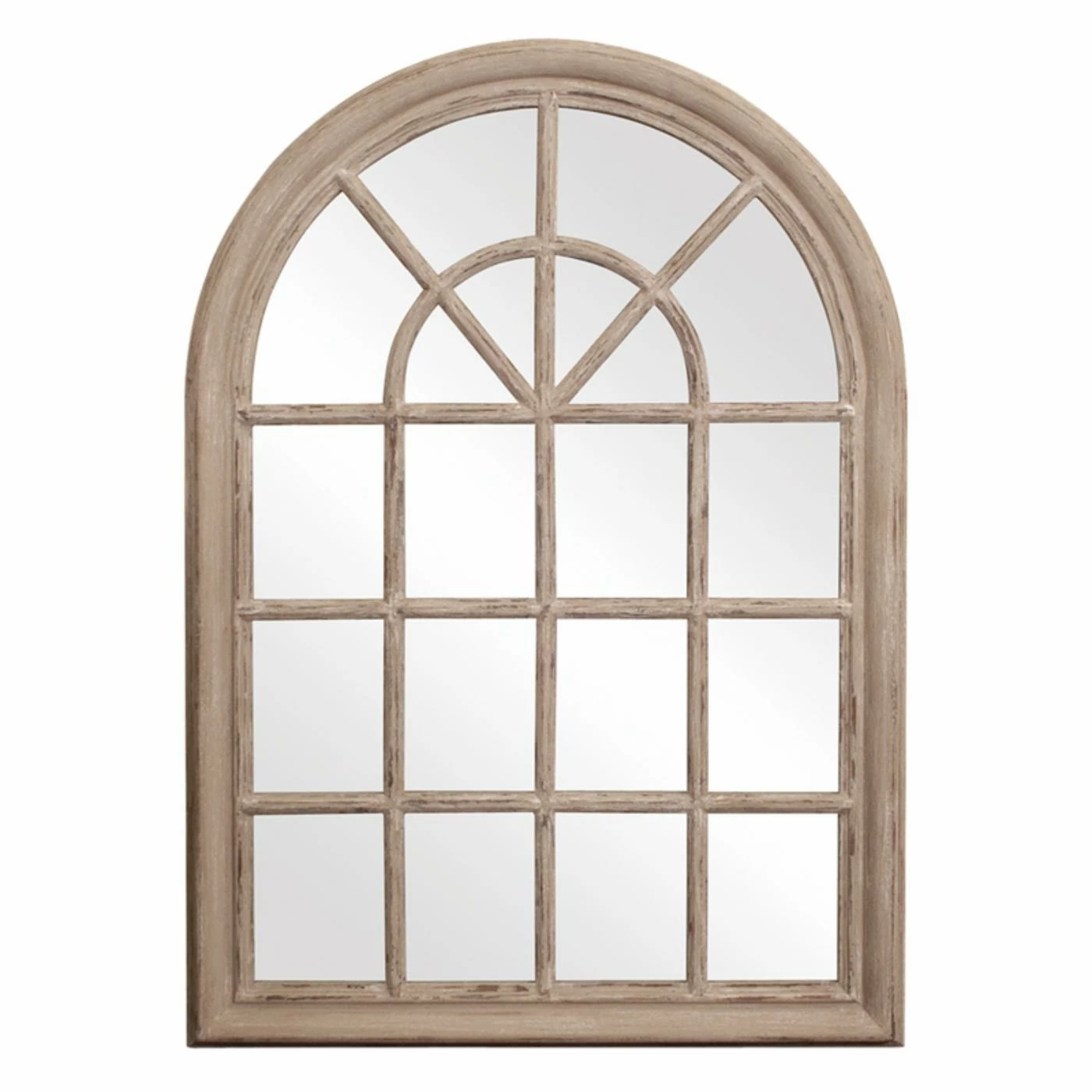 With its windowpane look and rustic feel, the Fenetre Wall Mirror is a natural complement to your modern dΓ©cor. This bold mirror features an arched frame made of high-quality wood finished in a distressed taupe lacquer.