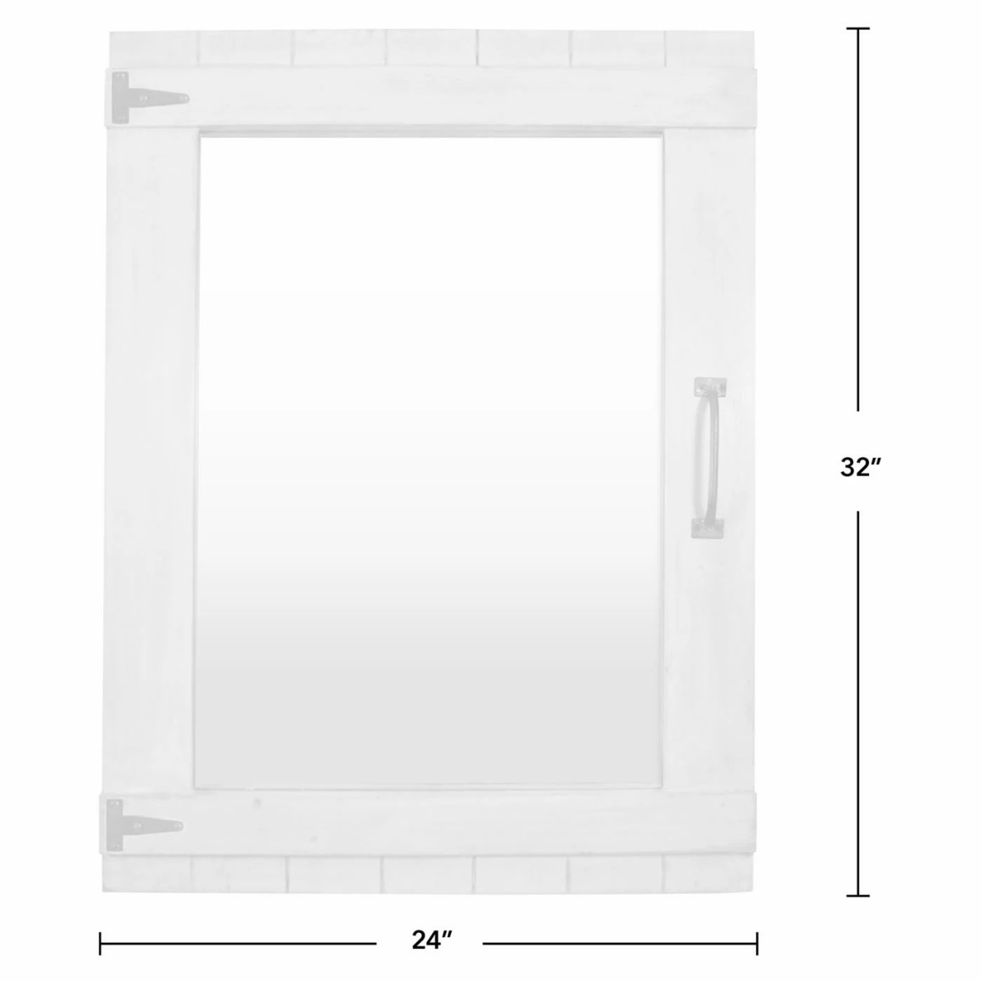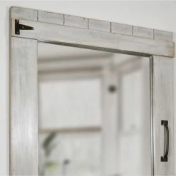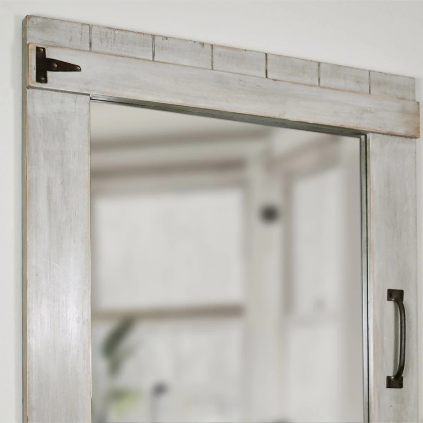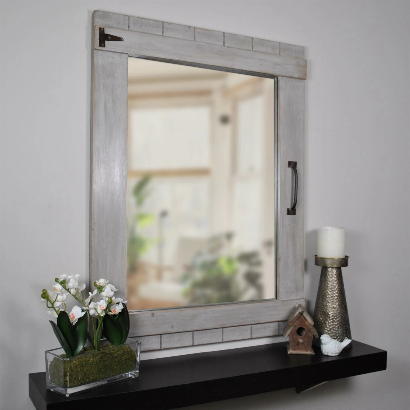 Infuse your space with rustic charm by hanging the FirsTime Weathered Barn Wall Mirror – 24W x 32H in. in your home. This mirror boasts an engineered wood frame with antiqued metal barn door accents.