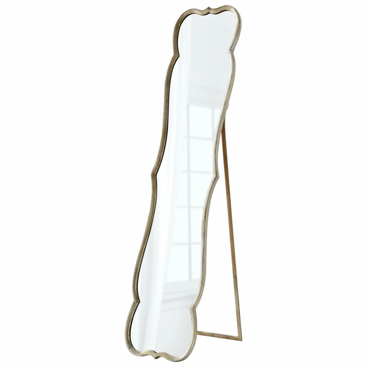Rest the Cyan Design Malinda Mirror – 15.25W x 70.25H in. against the wall, and you can check your appearance in elegant style. The scalloped, distressed silver metal frame features an angled leg to help it remain upright in the bedroom, bathroom, or hall.
