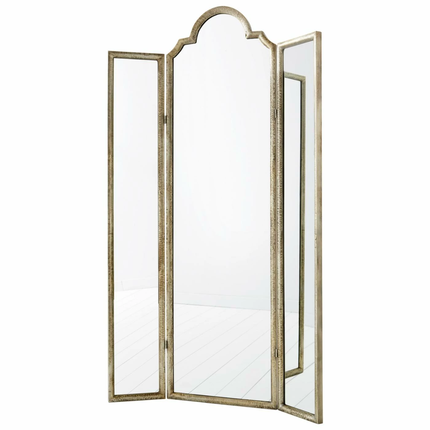 Fashionable and functional, the Cyan Design Percy Mirror – 44.5W x 75H in. features a tri-panel design in an elegant, distressed silver finish. Hinges make it possible to adjust the position of the side panels, so you can easily use the wood and metal mirror to check your appearance in the bedroom, bathroom, or entryway.