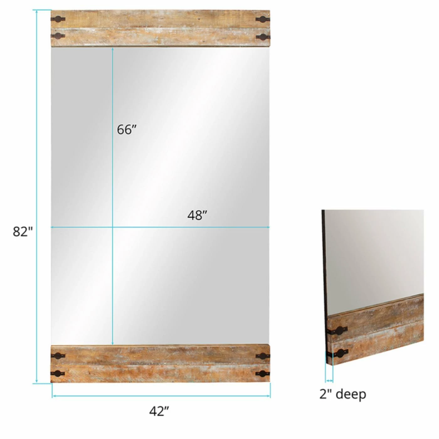Accent your rustic or western-inspired space with the Elizabeth Austin Garrett Wood Floor Mirror. Wonderfully accented at the top and bottom with reclaimed oak planks and wrought iron bolt accents, this impressively oversized floor mirror arrives ready to safely lean against the wall with security hardware or if you wish to hang it, there are D-rings affixed to the back. Brighten your room with the expansive style of this striking mirror.